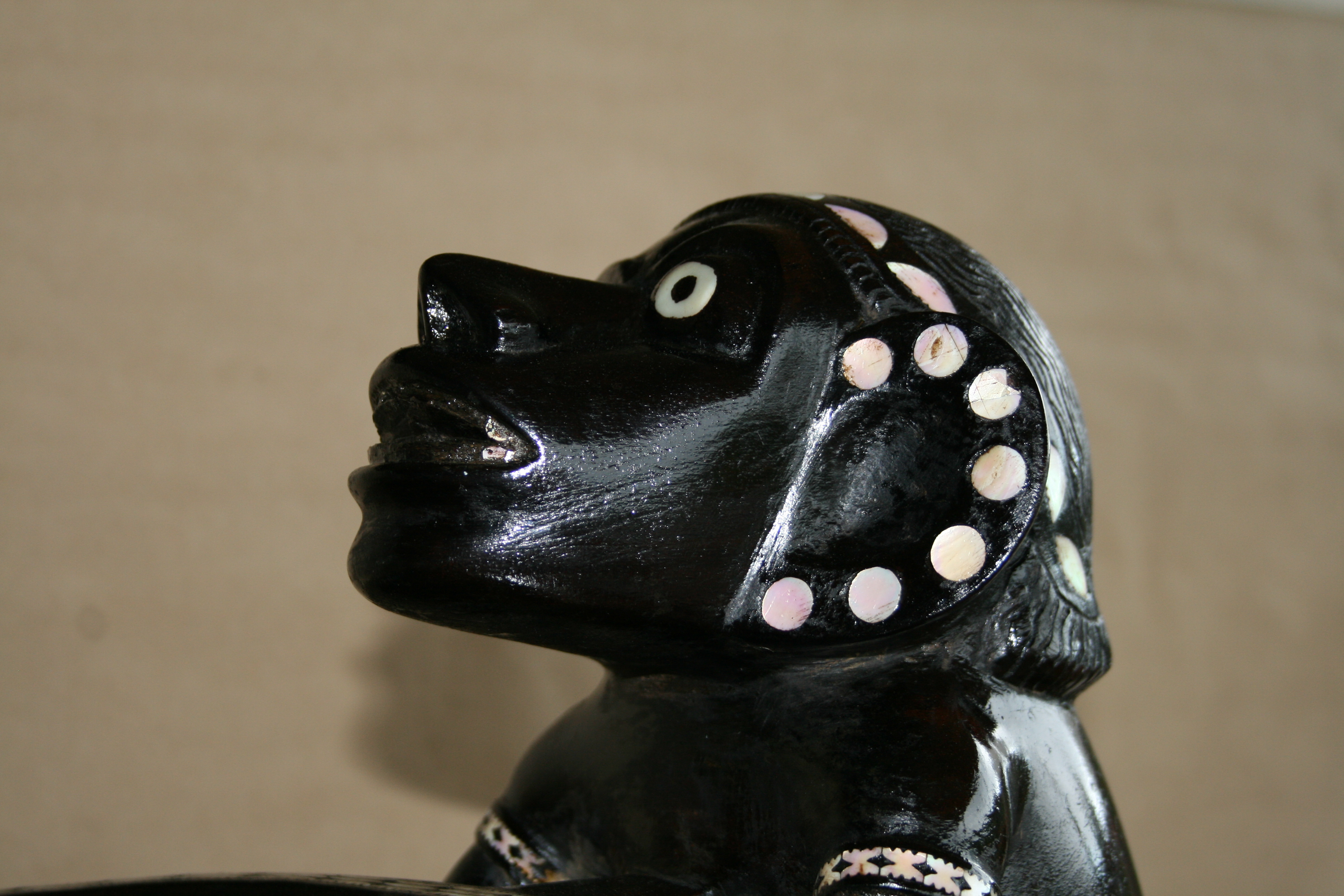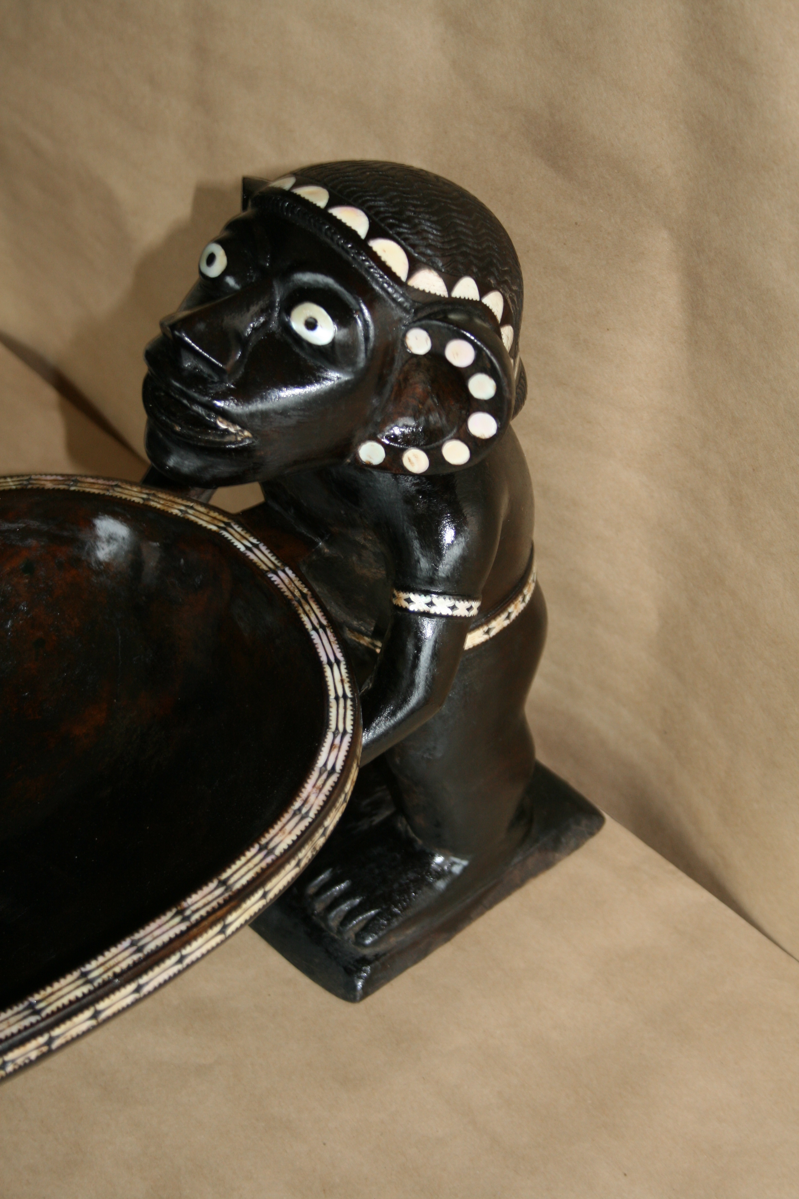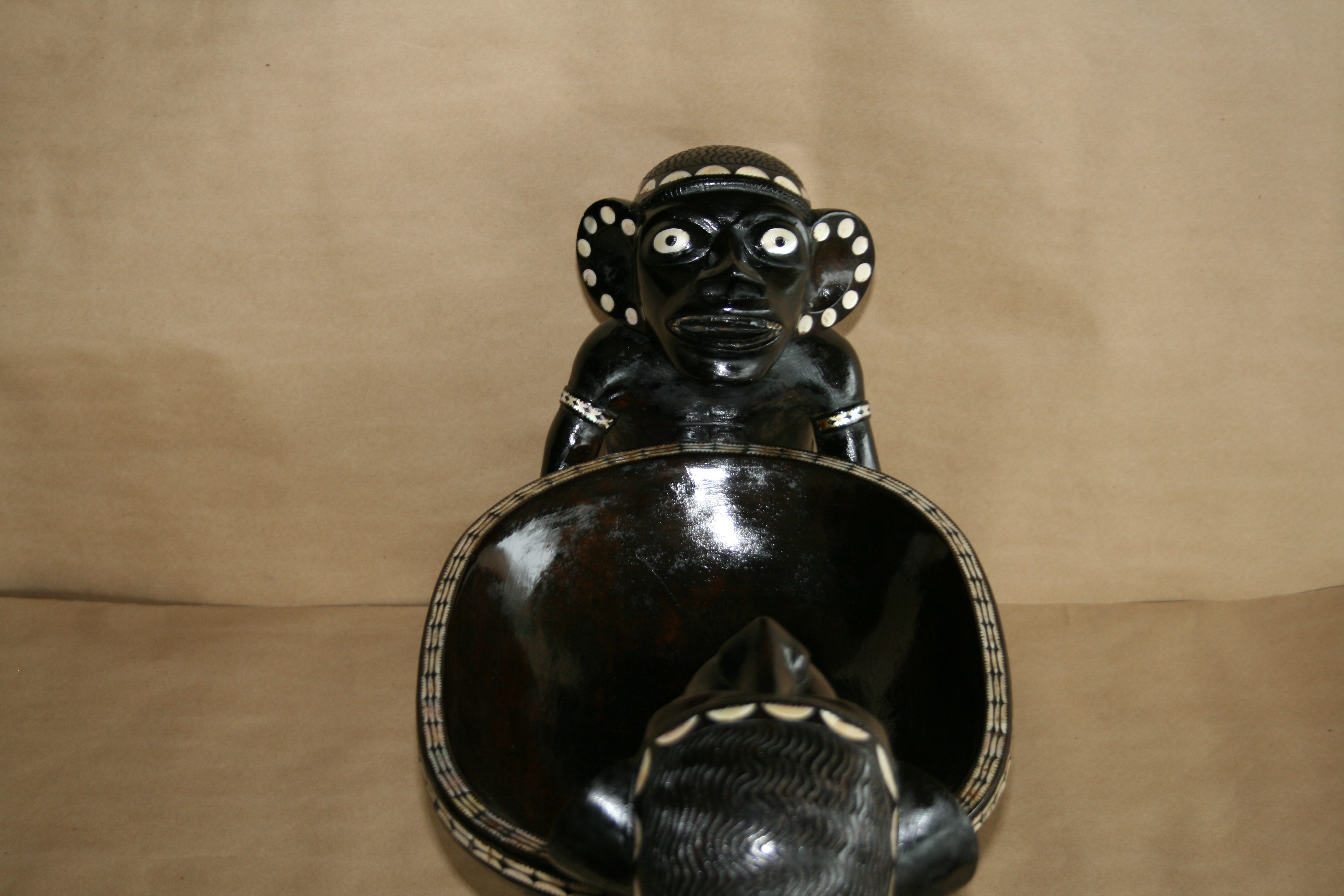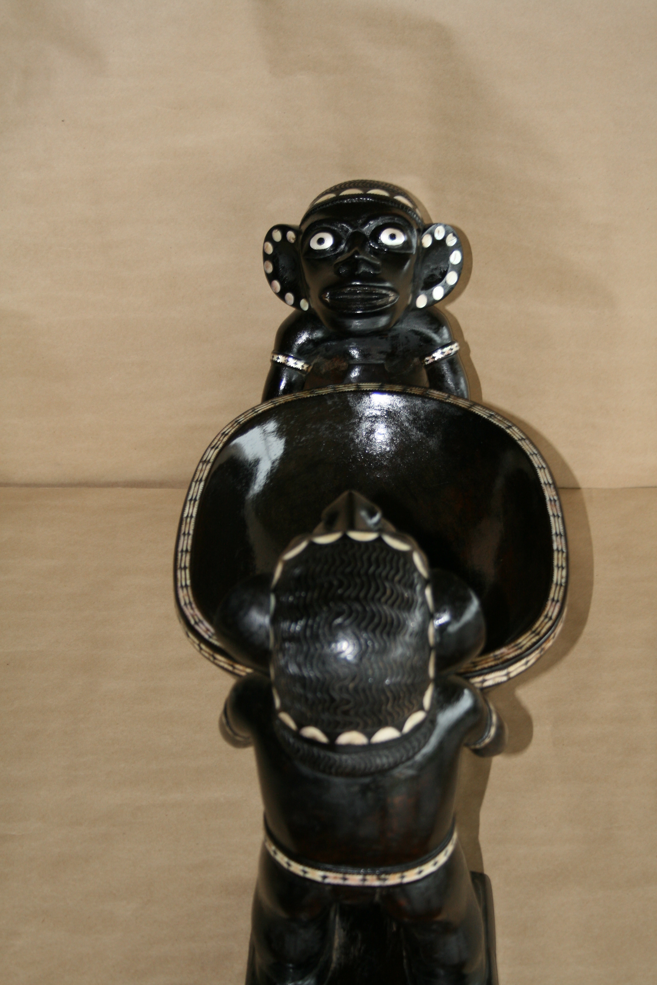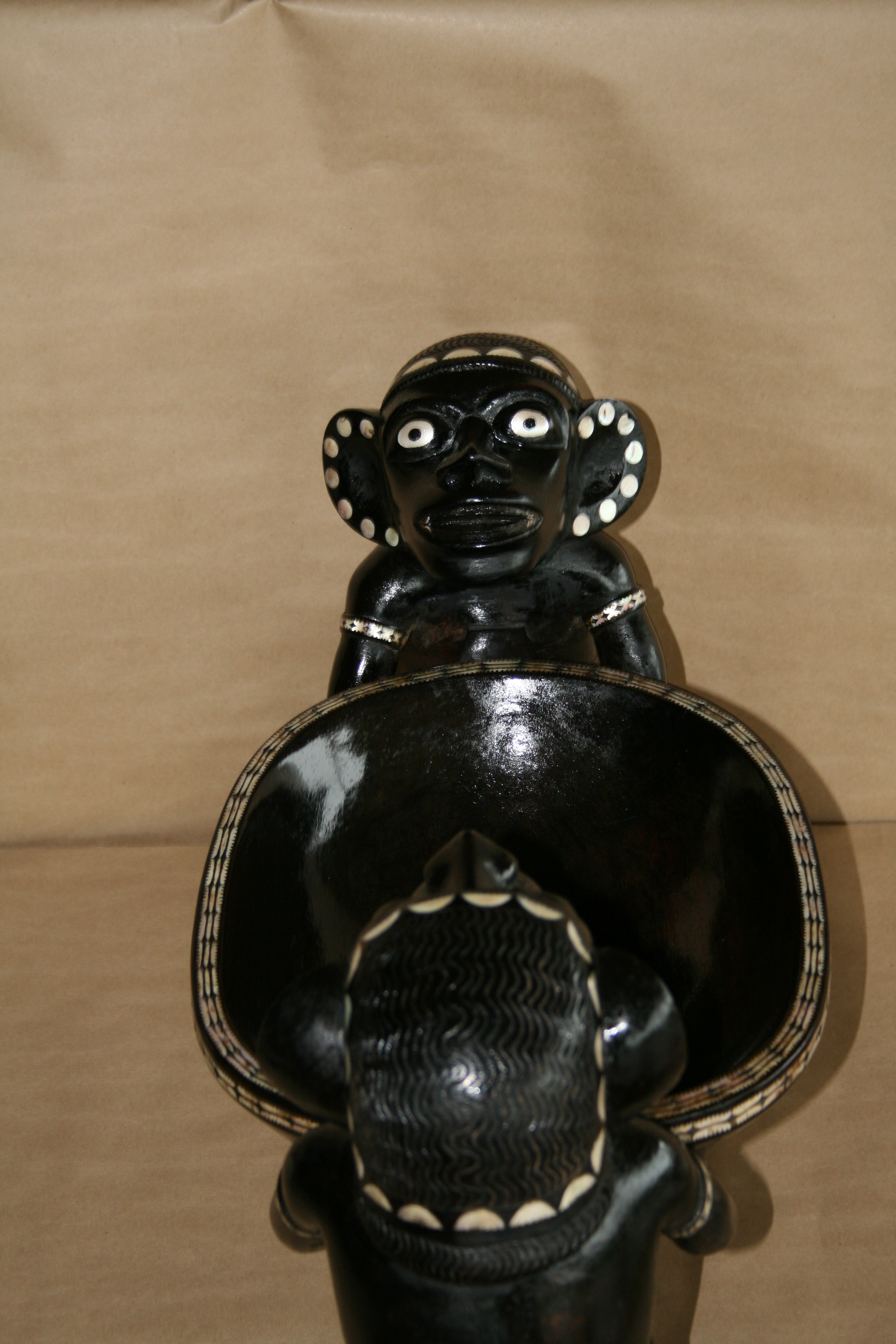 Highlights include the very fine inlay work. The teeth appear to have been inlay at one time. The strange symmetry of the twin Kakamoras is interesting from all angles.