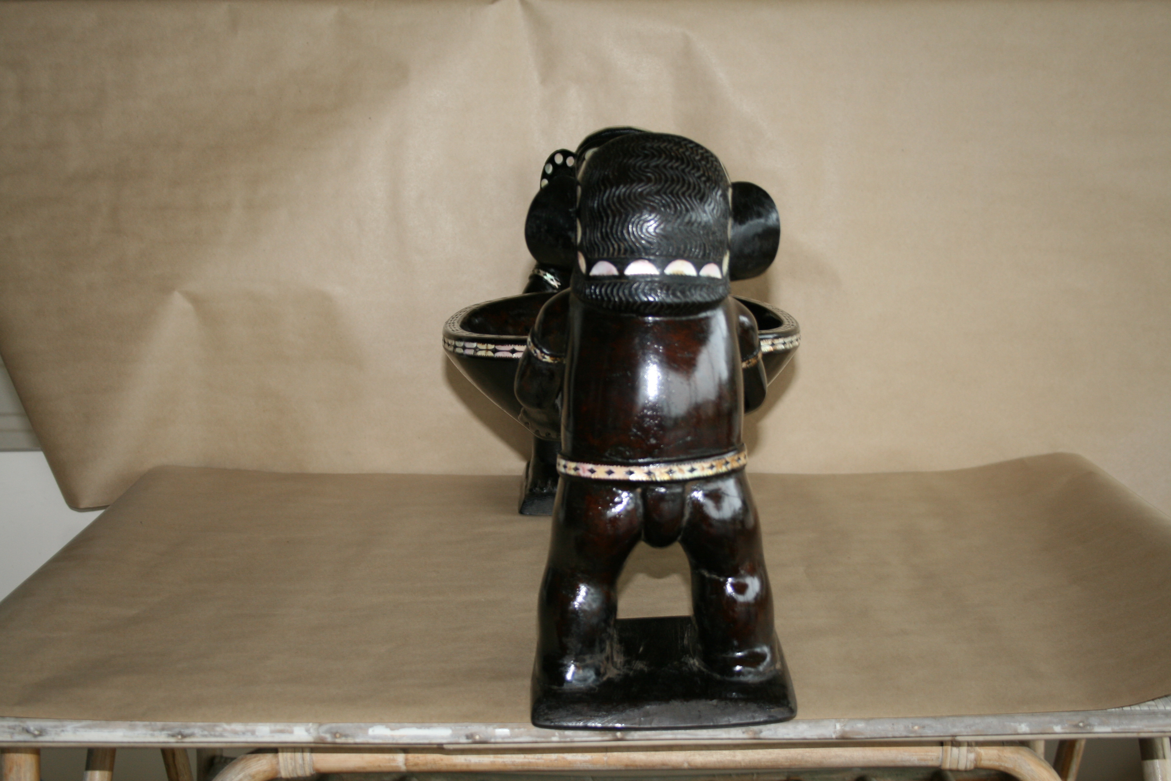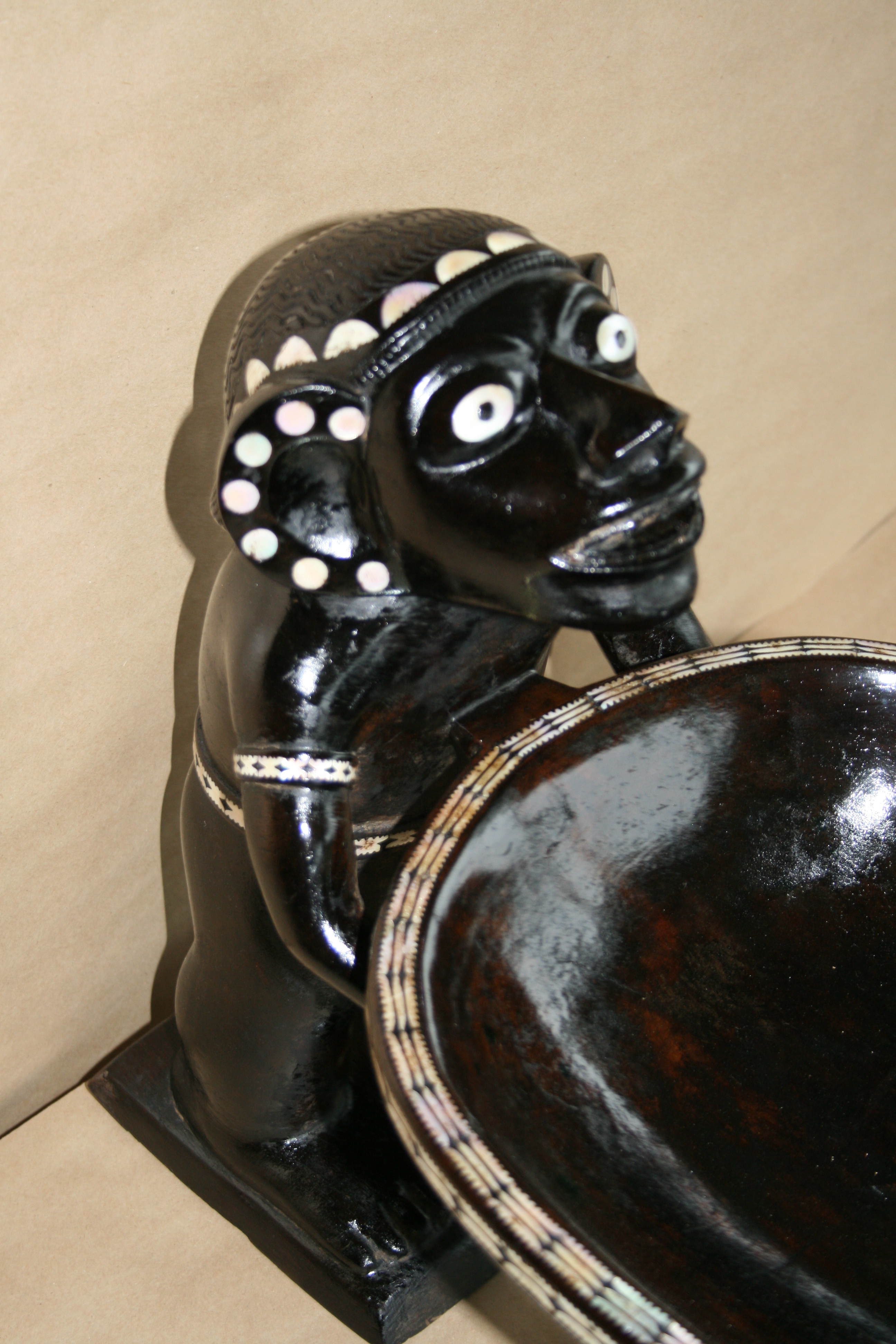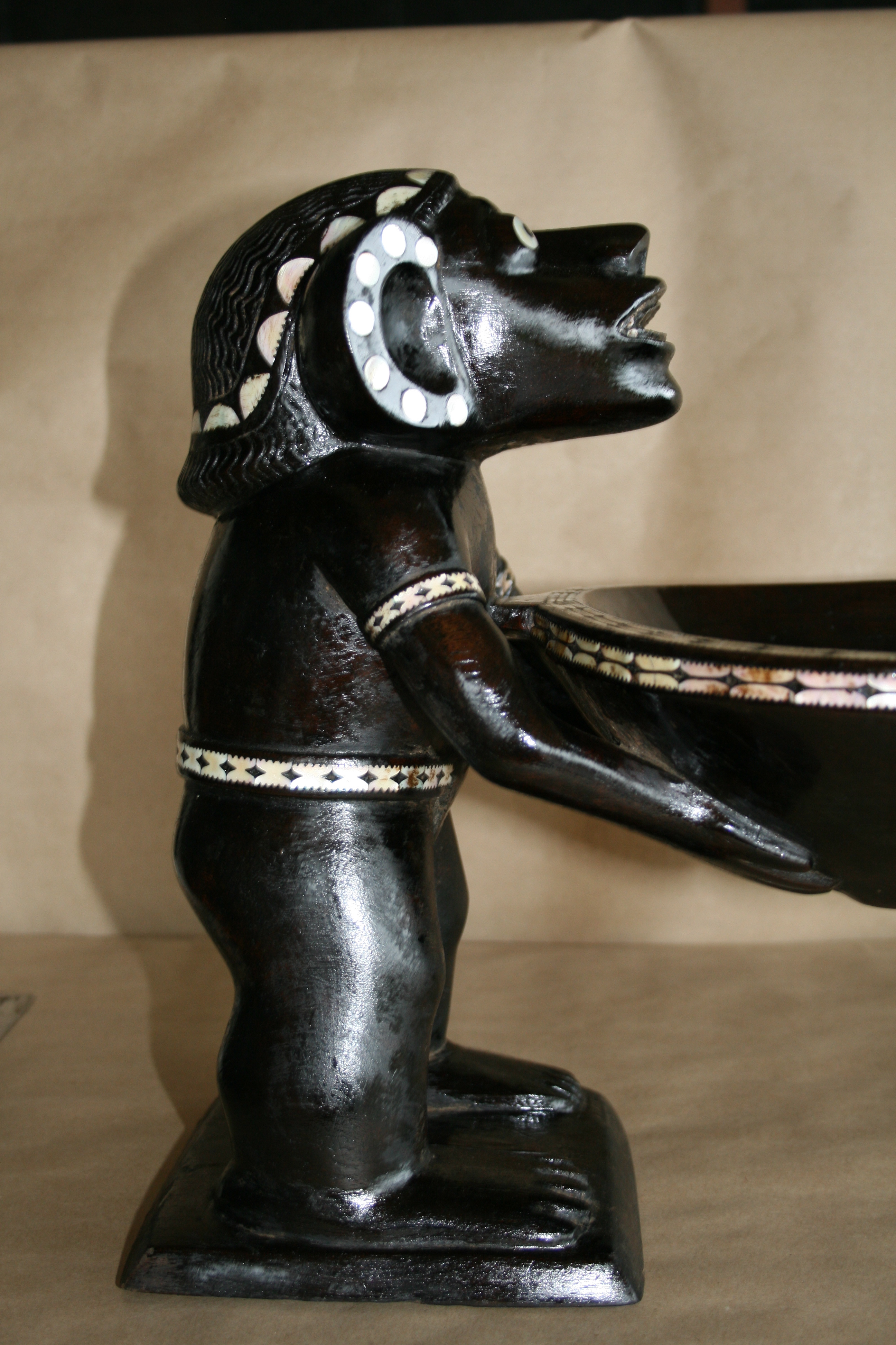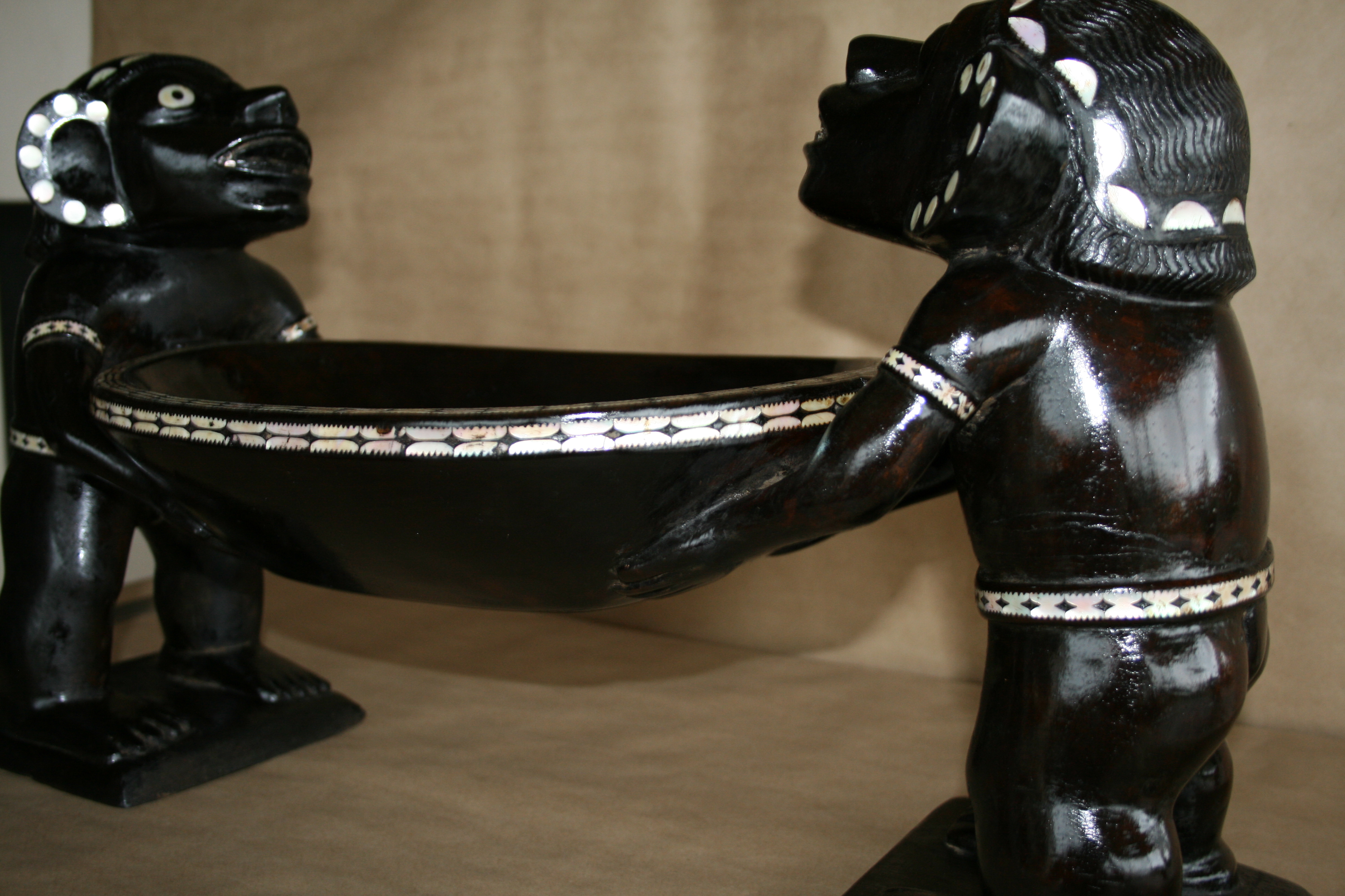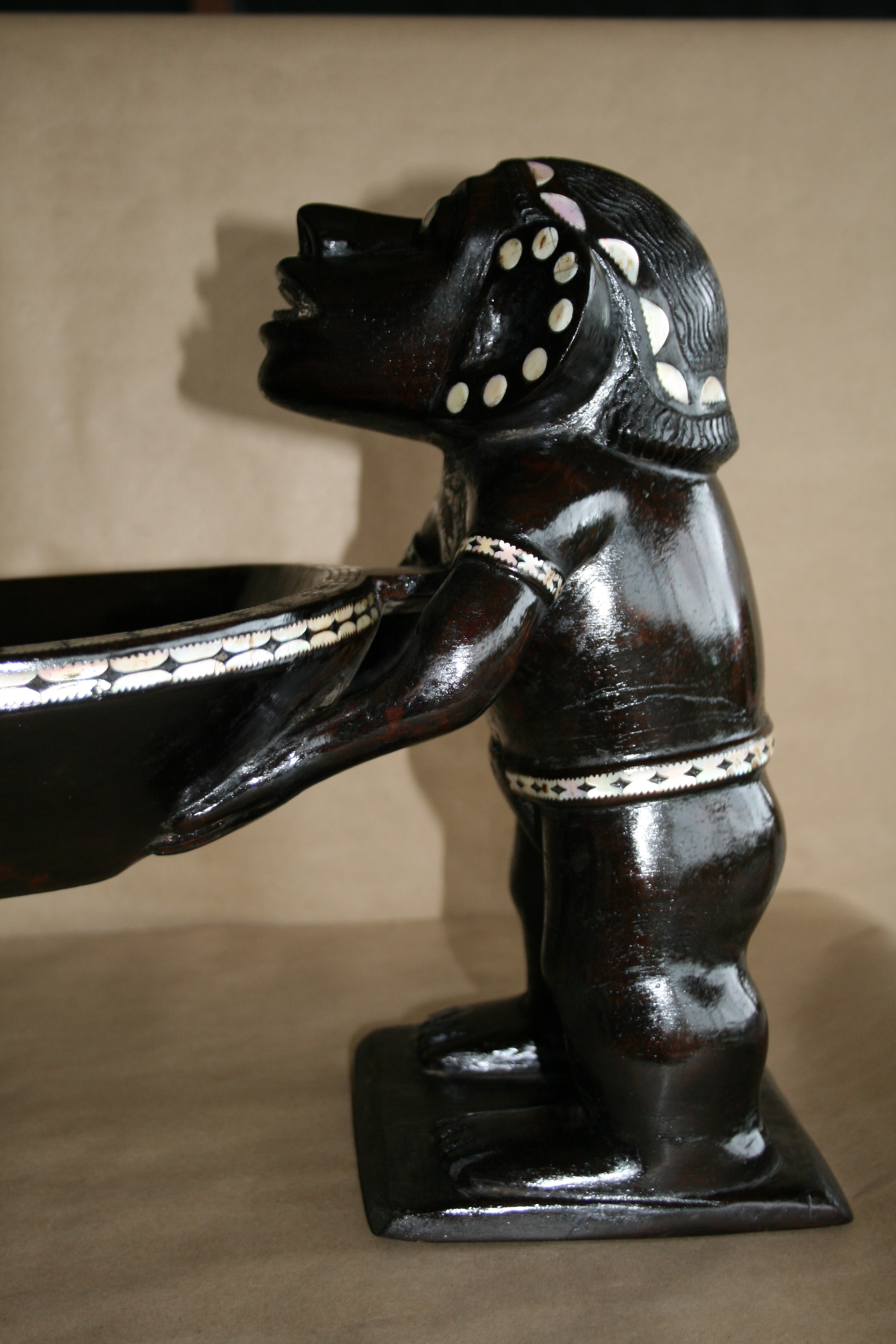 Highlights include the very fine inlay work. The teeth appear to have been inlay at one time. The strange symmetry of the twin Kakamoras is interesting from all angles.