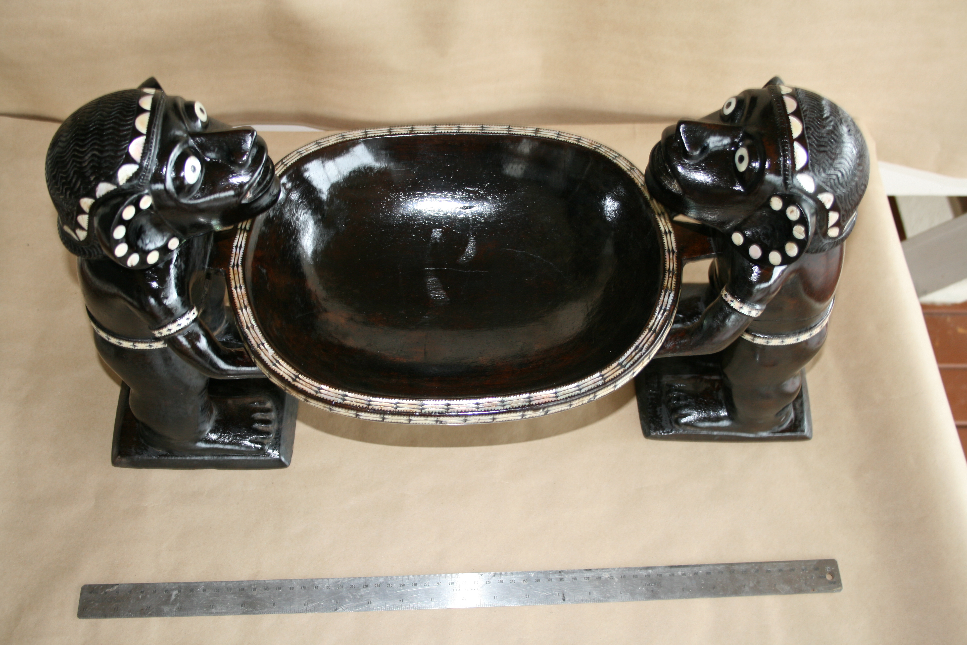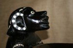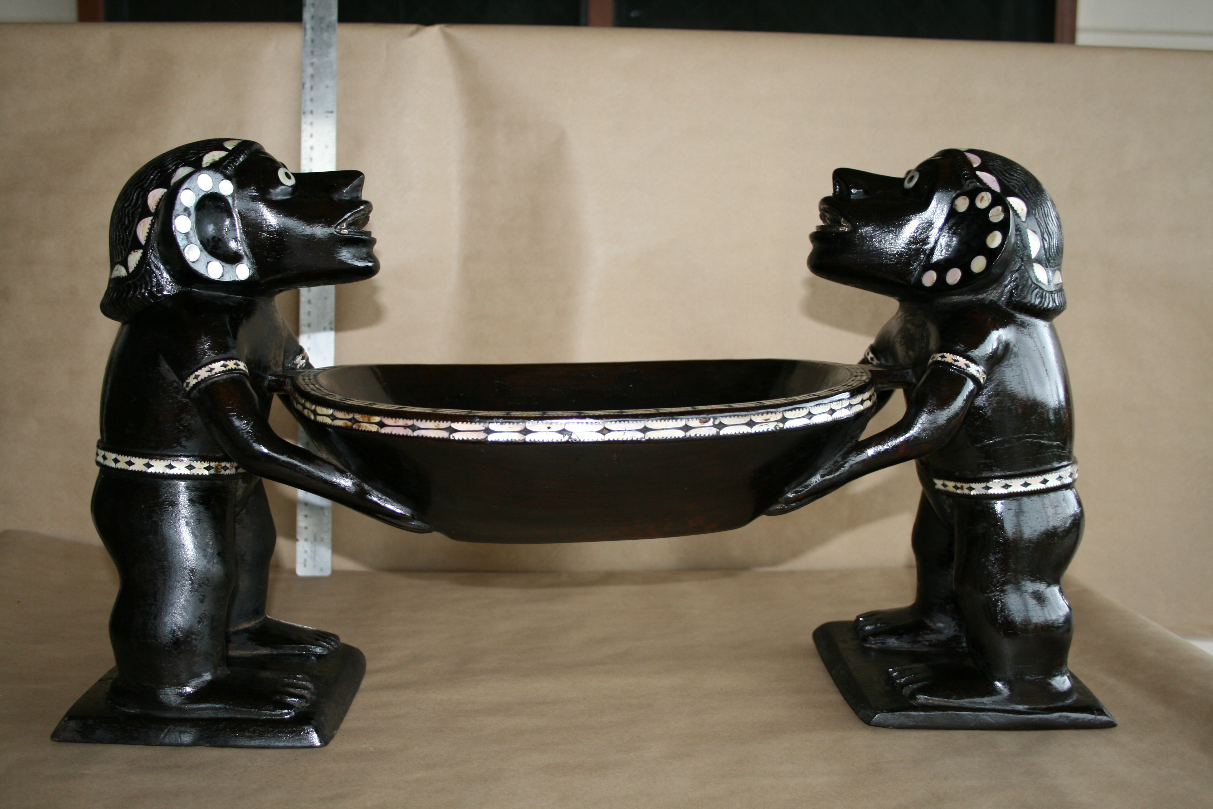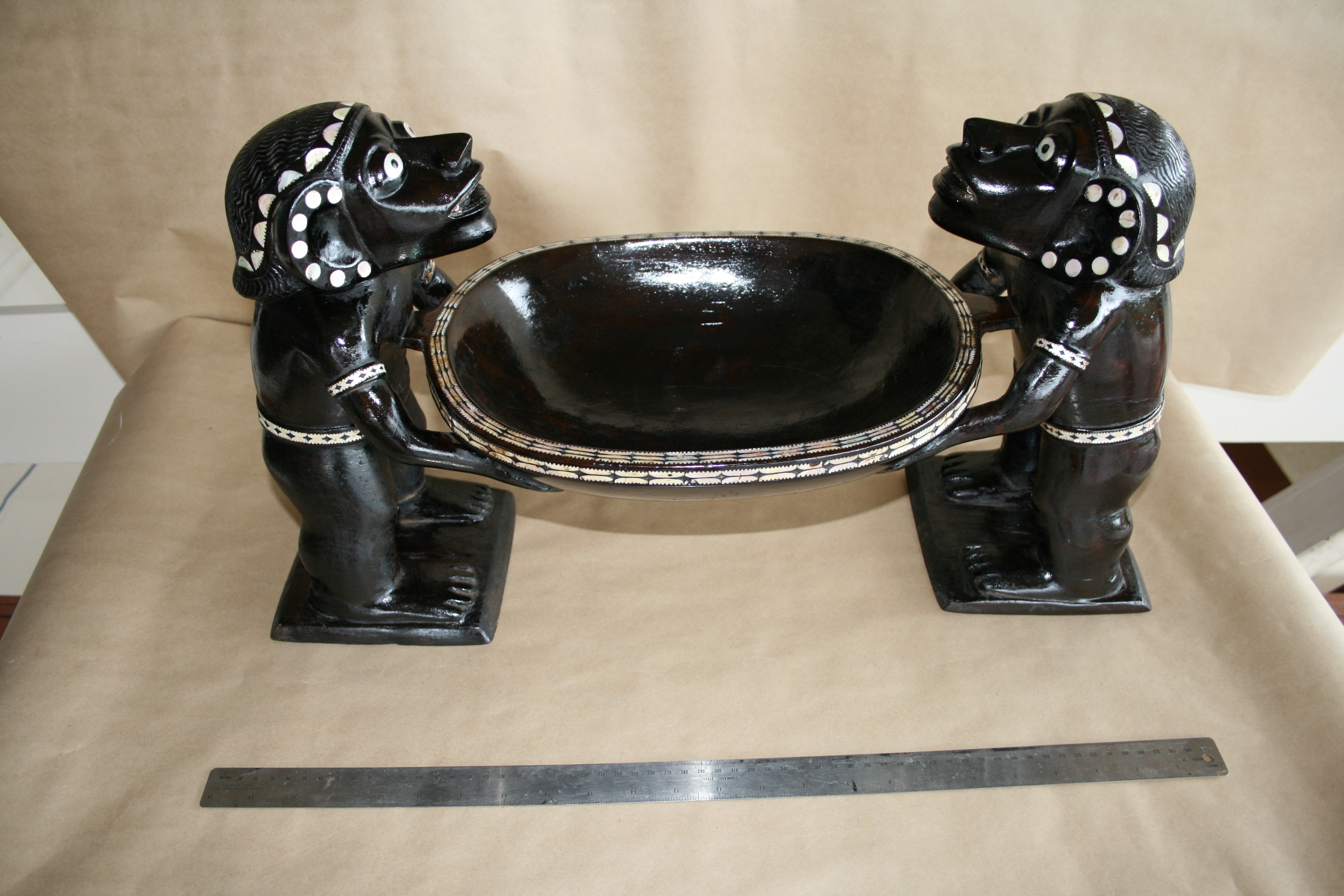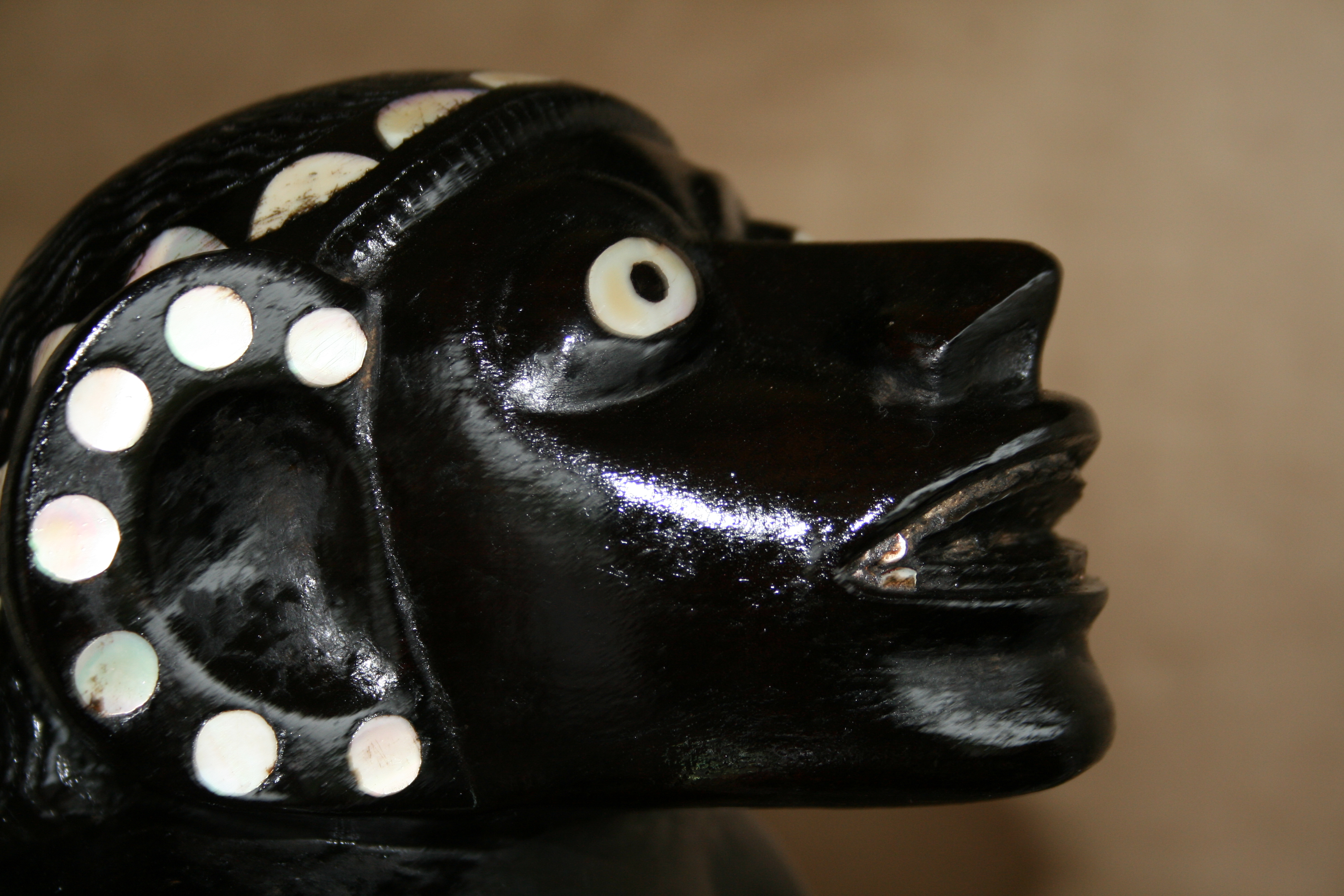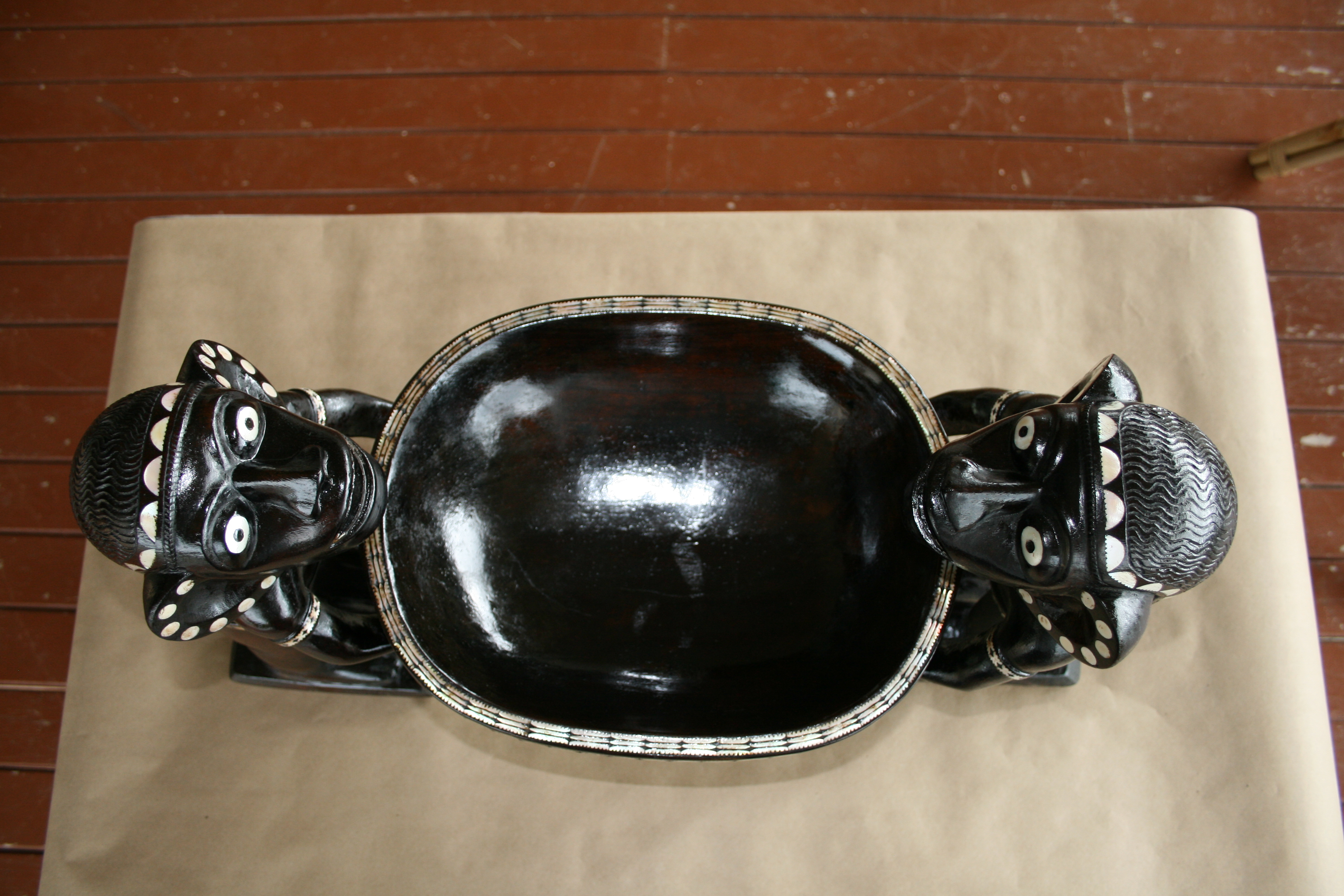 Highlights include the very fine inlay work. The teeth appear to have been inlay at one time. The strange symmetry of the twin Kakamoras is interesting from all angles.