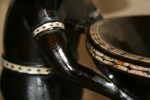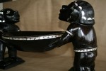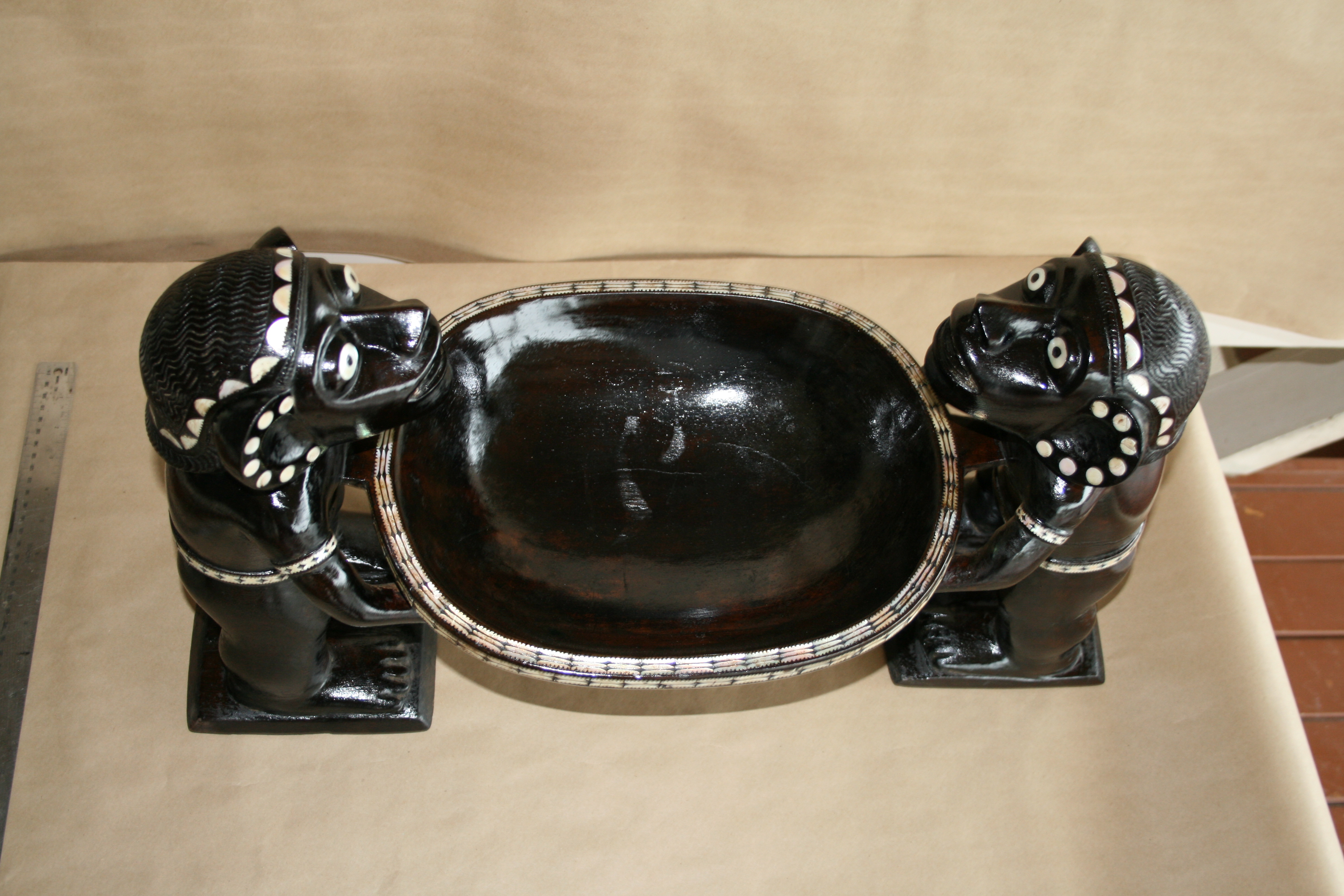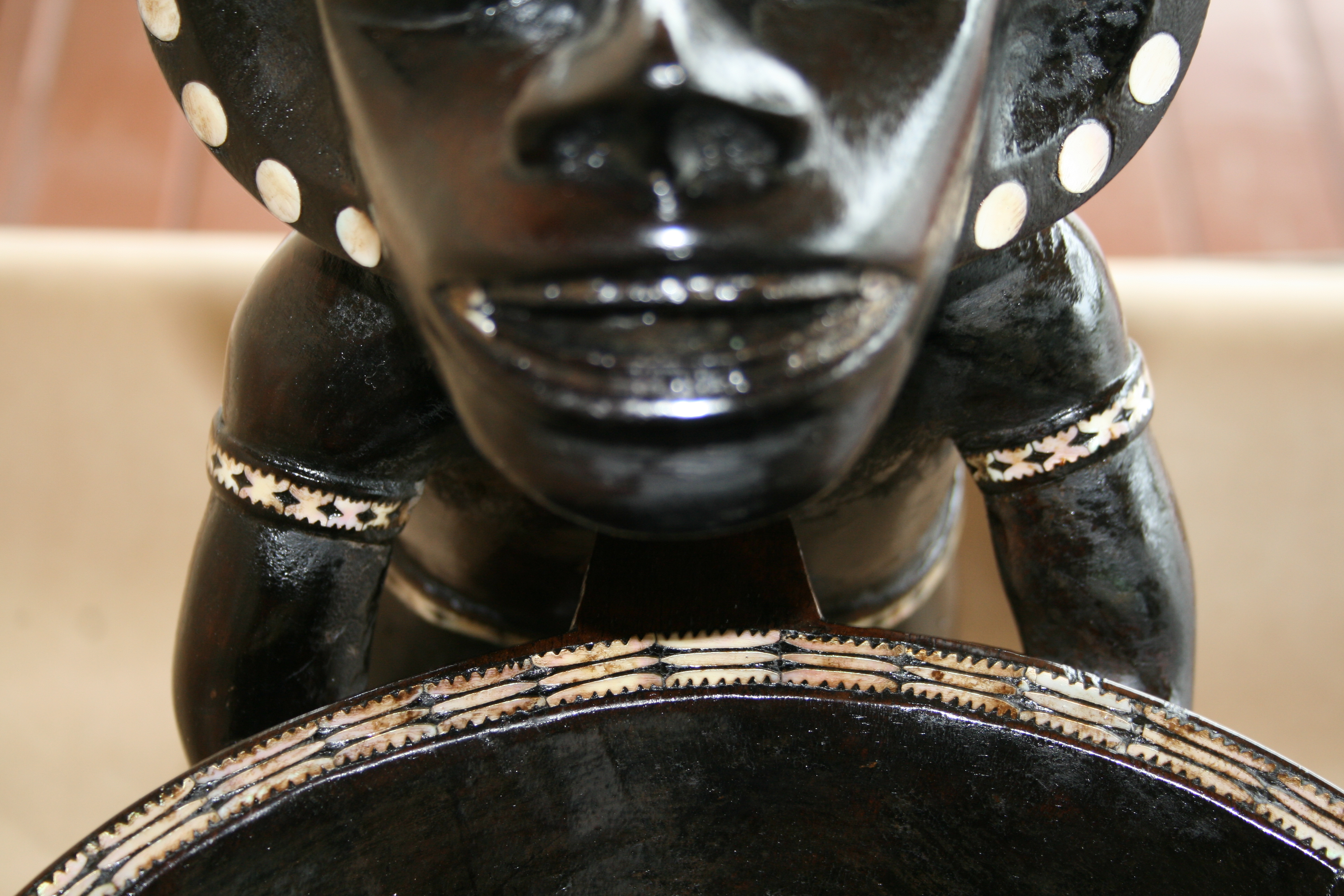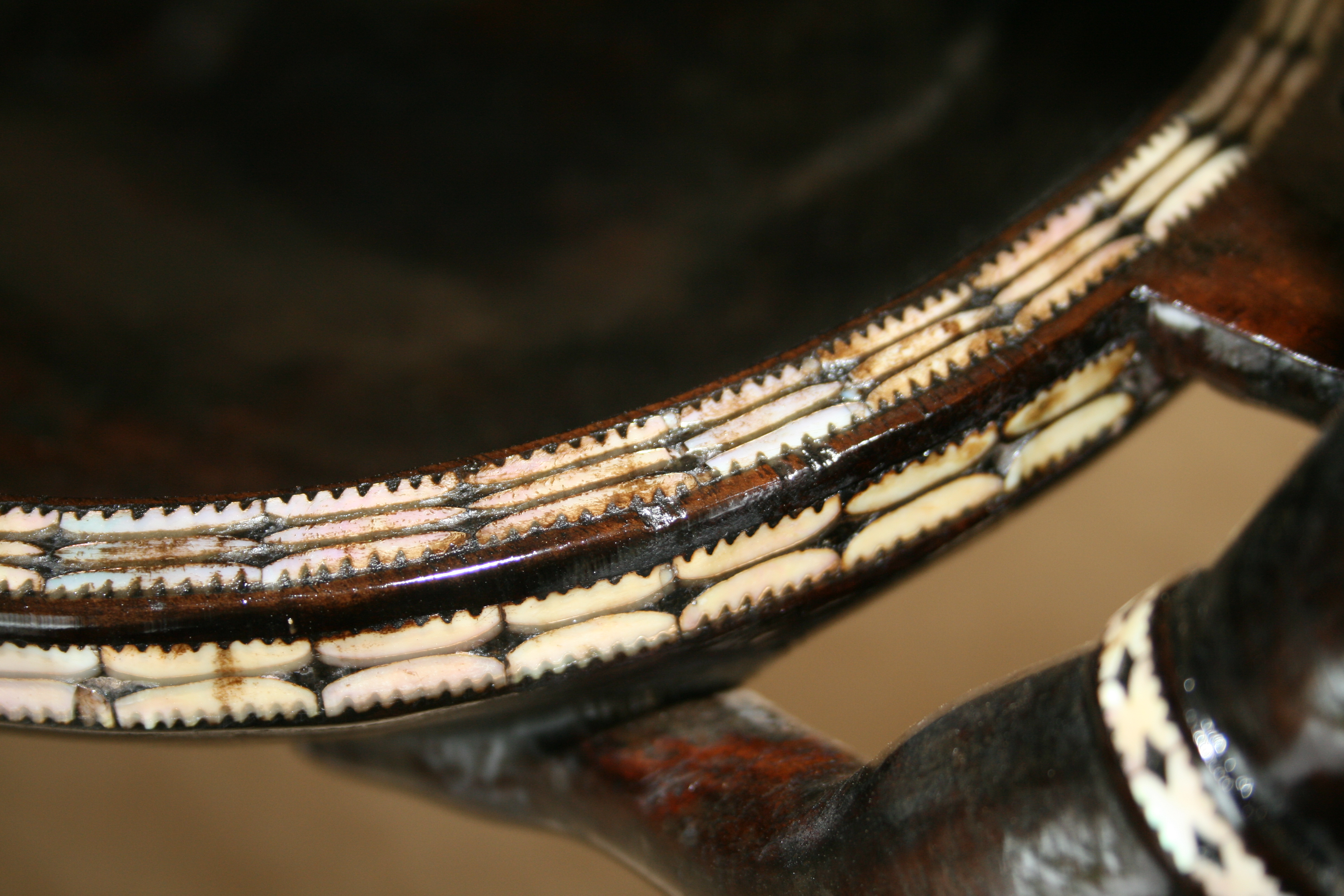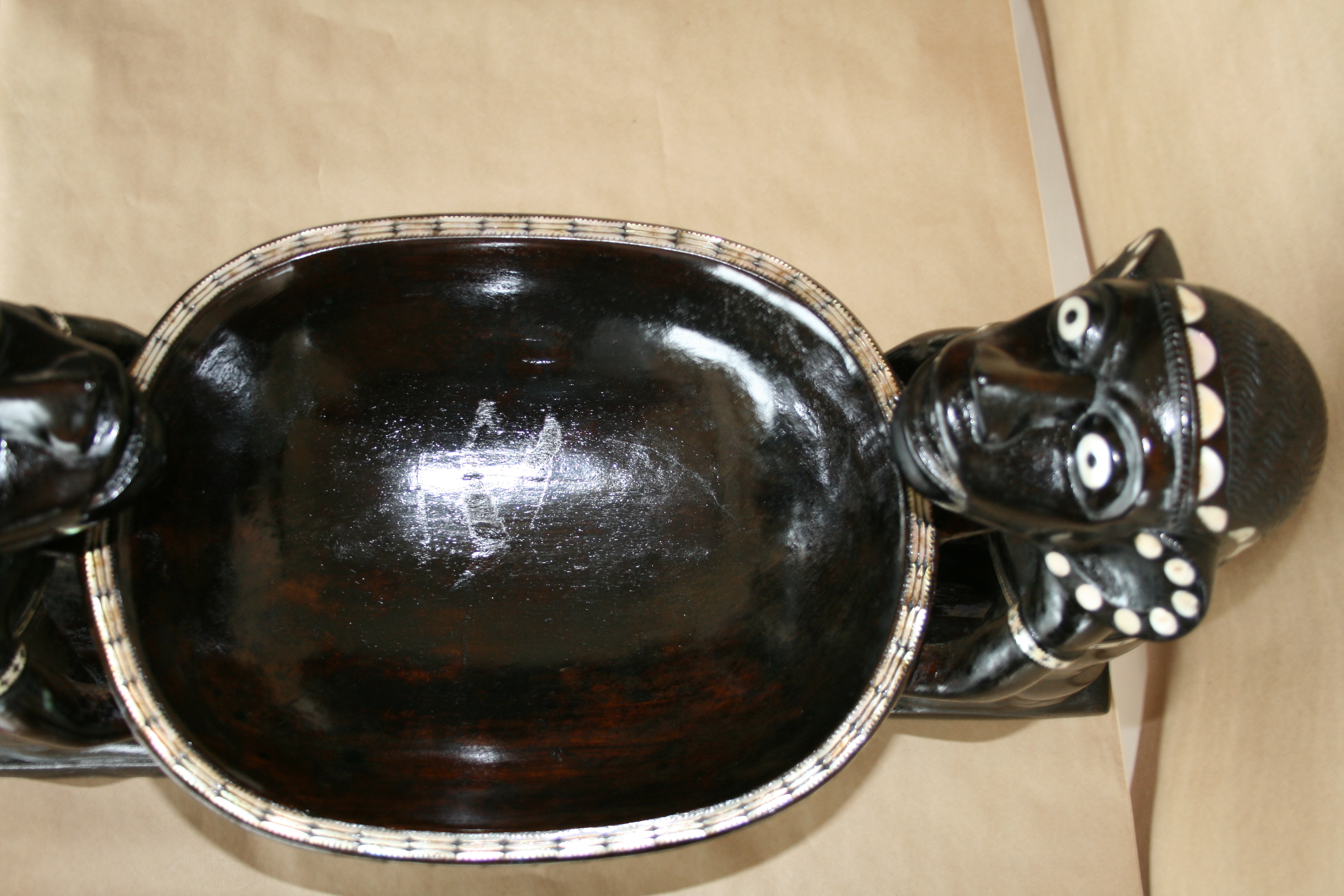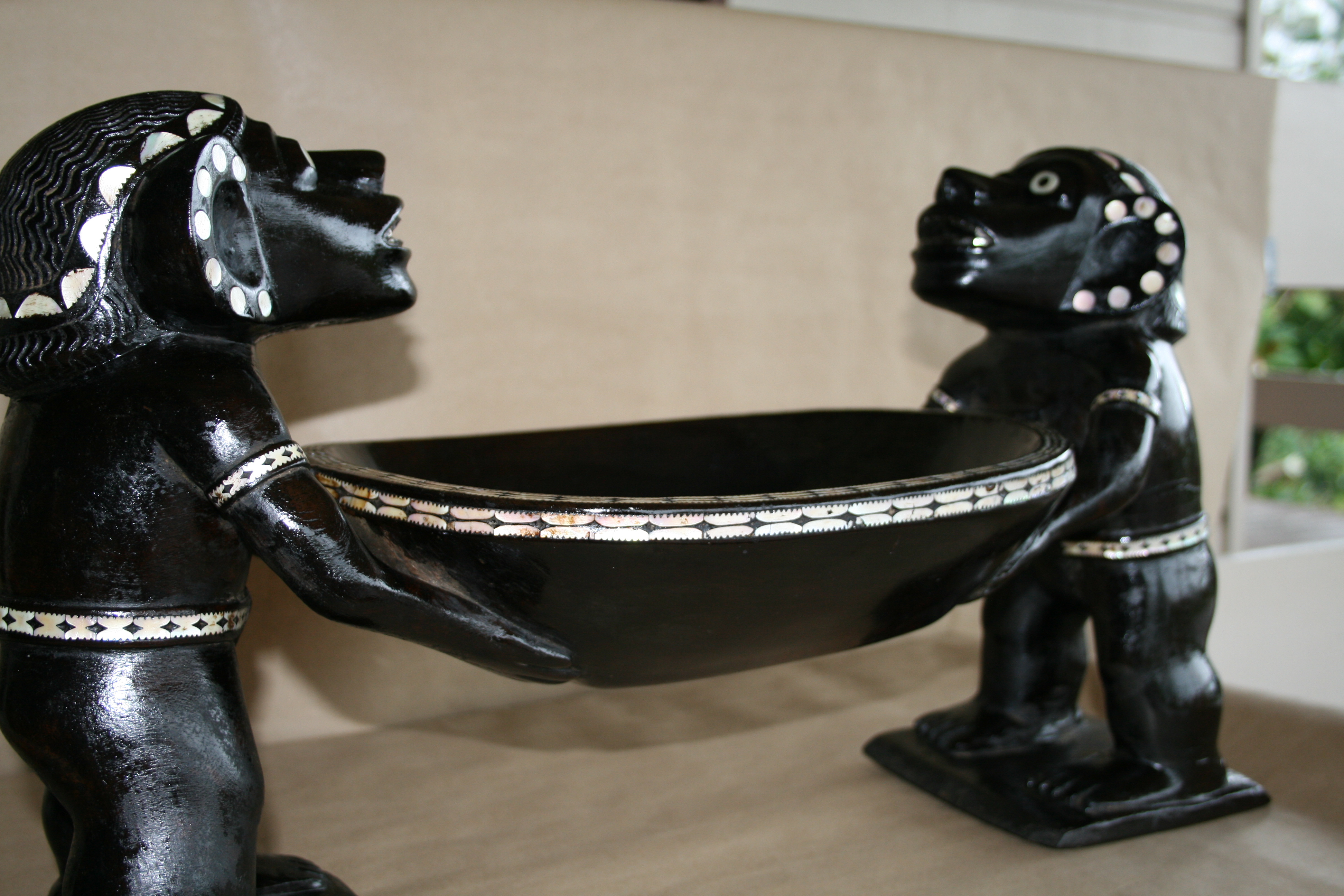 Highlights include the very fine inlay work. The teeth appear to have been inlay at one time. The strange symmetry of the twin Kakamoras is interesting from all angles.