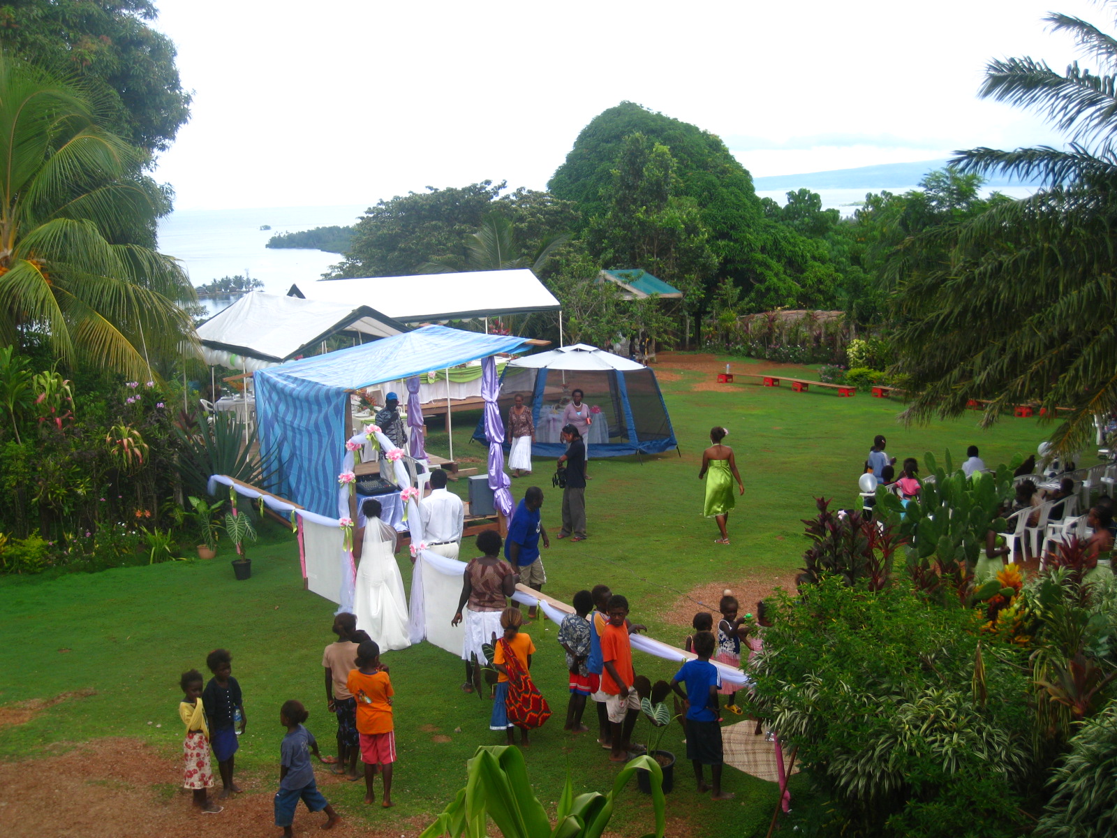 The wedding, like all island weddings, was a long, complex affair. Mike (the Native Iowan and the father of the groom) and I had absolutely nothing to do with putting it together. It was all “sait blong Meri” (“side belong Mary”), which means women’s business. So his wife was in charge, we were just out of town guests. Mike’s house is atop a hill overlooking the harbor and the endless ocean. You can see over a dozen islands from the house. It has a roofed second story verandah all around the house, tropical style. We sat up on his verandah watching the wedding preparations fall apart and come together. When we got there they were putting stakes in the ground to hold up the bunting at the entrance to the reception.