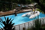 Speaking of which… I put a flying-fox up over the pool for this party. It is kinda funky but it works for kids up to about 8 – 10. I used a bit of old yacht-braid and simply cannot pull it tight enough, not to give. So we launch up the steps, about 10 feet or so above the pool. The kids get a few second ride holding on as long as they can then drop in the water. Drop too early you bounce on the deck. Too late and you collide with the side of the pool.