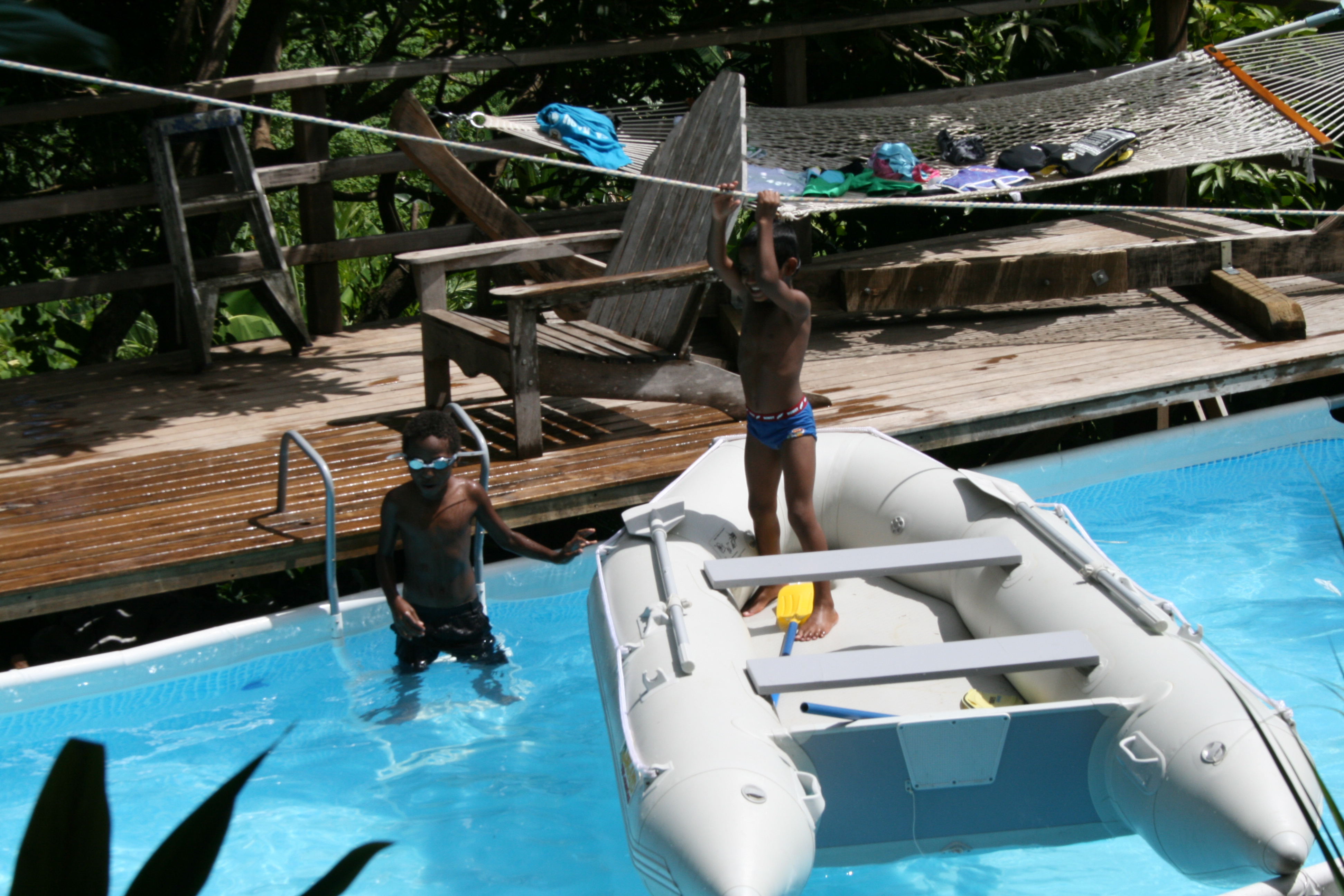 Sitting on the deck. Angelo, Mendozza and Angelina are in the pool. Or rather, in the boat in the pool.