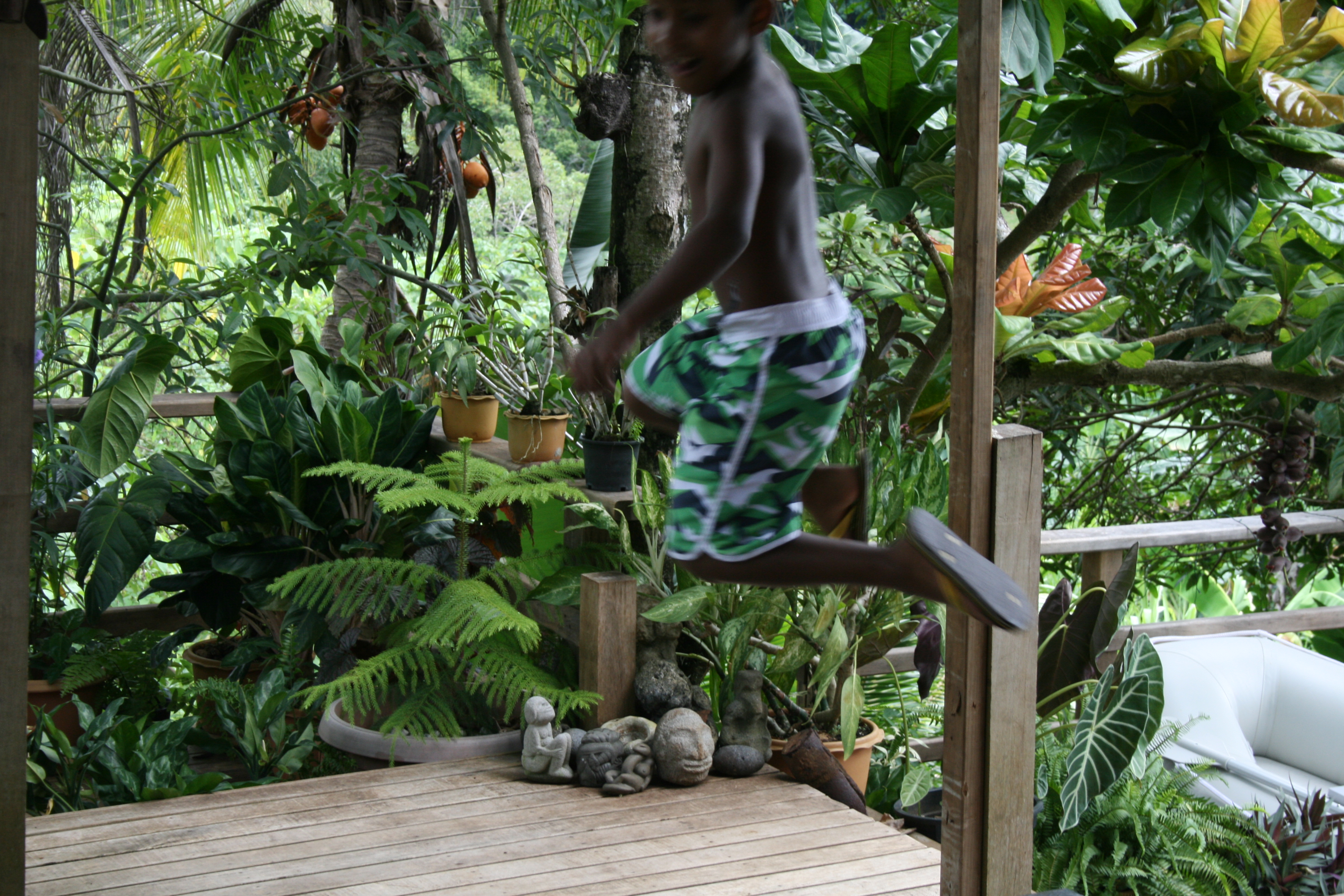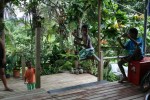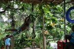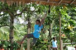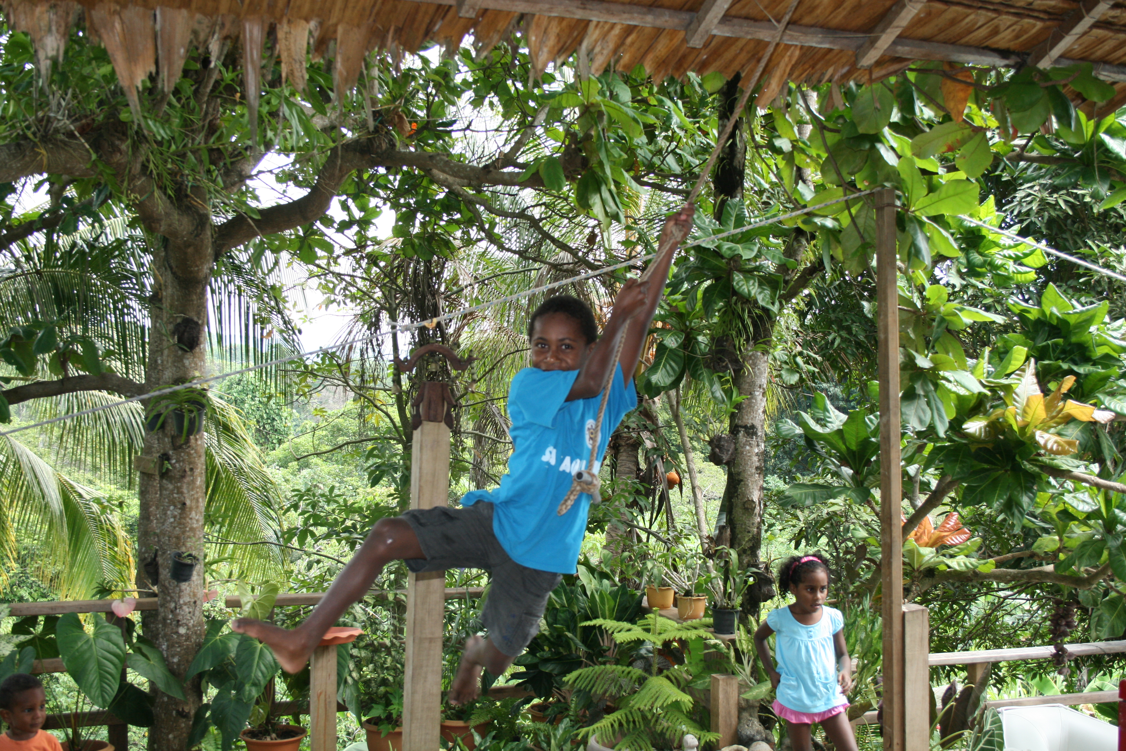 With all the boats we’re involved with we have a lot of neat ropes and pulleys. Like the flying-fox, we have rigging enough for lots of fun. The tarzan rope here started as a banana hanging rope and has evolved into a permanent fixture of fun. It allows them to get the nice side-kick thing happening with centrifugal force.