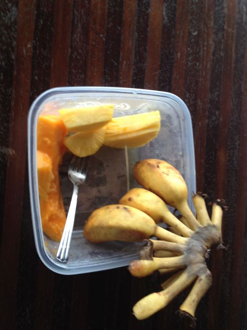The tub of pawpaw, pineapple, with a few bananas is what is left of lunch for today.