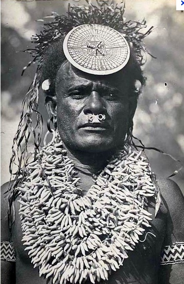 photo is circa 1900, subject is a chief/ warrior from the island of Vella La Vell, in the Solomon Islands. I believe his name was “Bula” and was a renowned and fear head hunter.