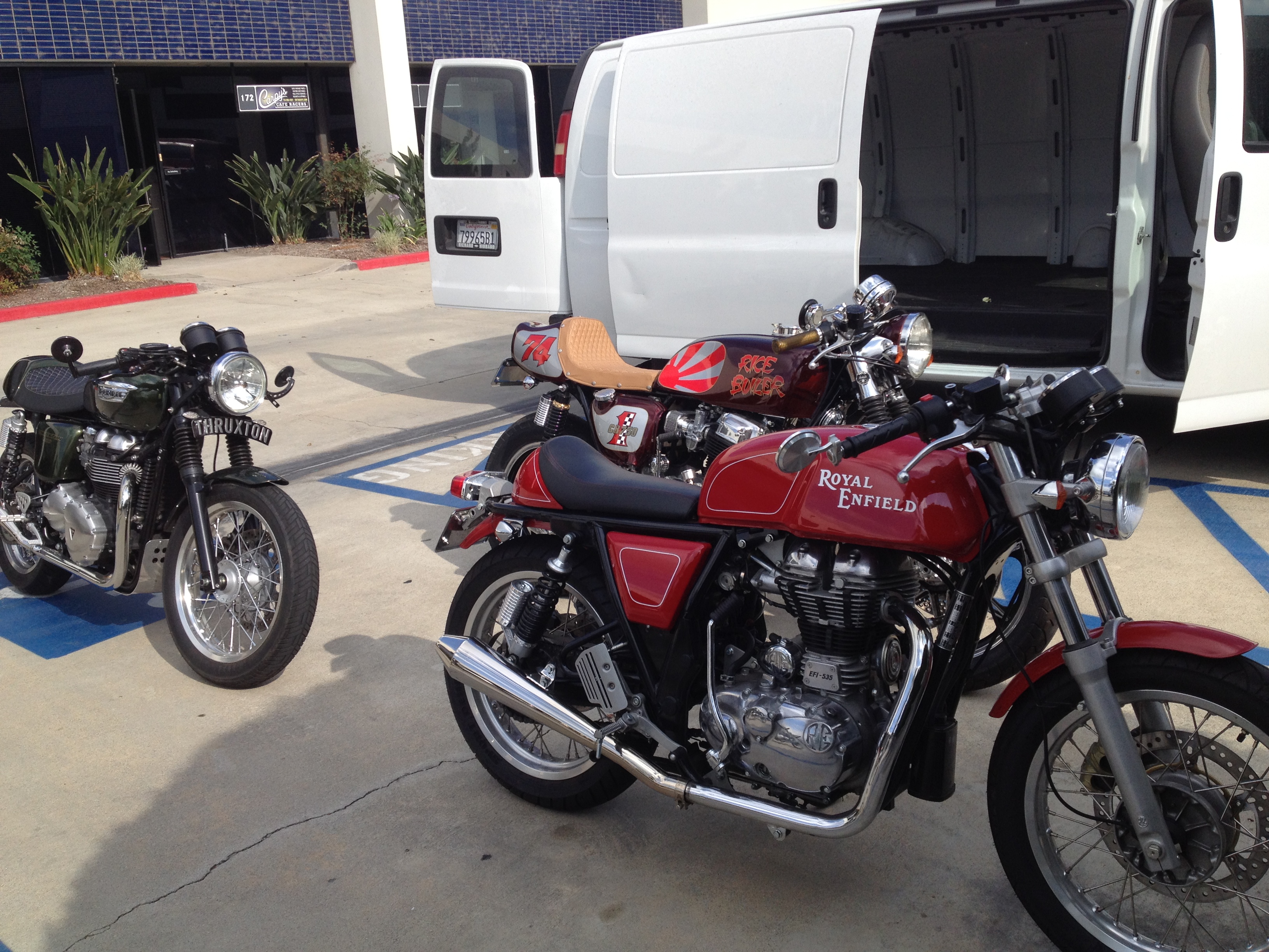 Went to say g’day to my buddy, Steve Carpenter, this morn. “Carpy” is a mad-Britt transplanted in SoCal. His thing is building bitchn’ cafe racers. Check his www. out: http://www.cb750cafe.com/ When I rode up this morn, it was way too easy to see which place was his…
