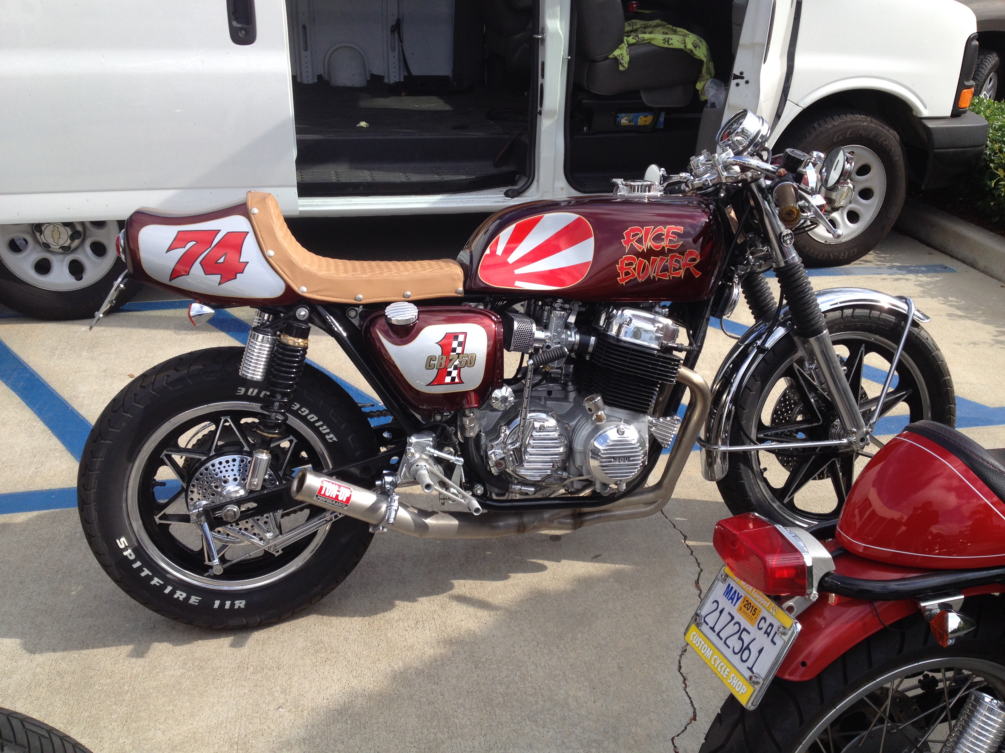 Guess this to be a 74 Honda CB 750 customised as the “Rice Boiler”