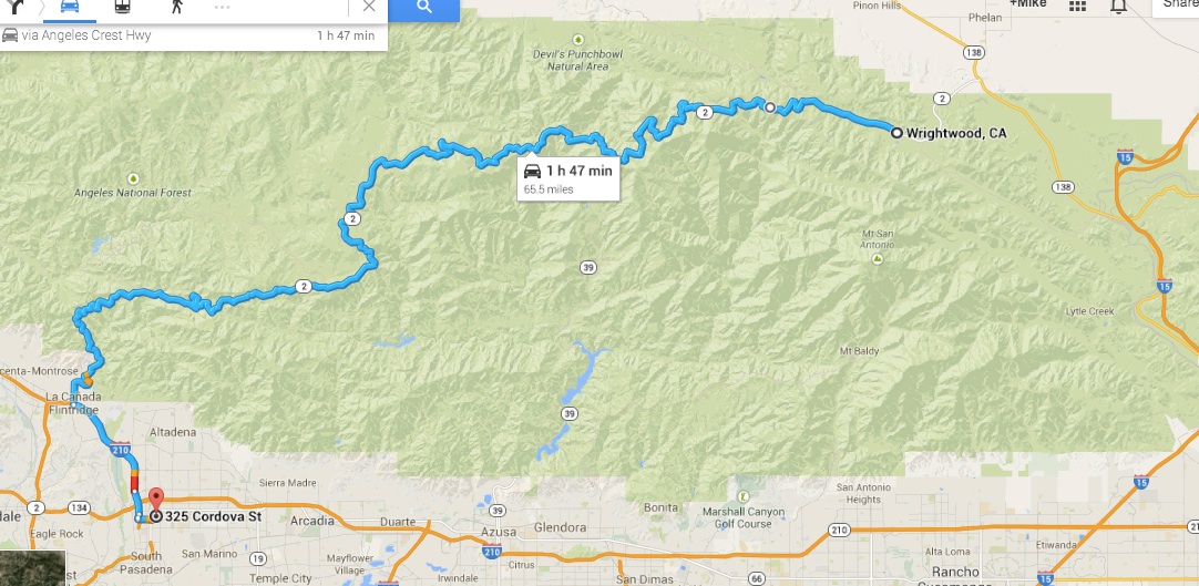 The route turns north onto the Angeles Crest Highway, cutting through an obscure mountainous portion ofPasadena. This route winds generally east-northeast through the canyons of the San Gabriel Mountains for over 80 miles (130 km), before descending through Big Pines and Wrightwood to the edge of the Victor Valleyapproximately 20 miles (32 km) west of Hesperia and ending at SR 138. Starting in La Canada Flintridge at an altitude of 1,300′ (394m) the highway climbs to a high point of 7,903′ (2,395m) at Dawson Saddle. The eastern portions of the Angeles Crest Highway are notoriously dangerous, with many switchbacks and blind curves, and are often closed during occasions of heavy winter snowfall. The highway is generally closed between Islip Saddle and Vincent Gap from mid-December to mid-May due to snow and rockfall.