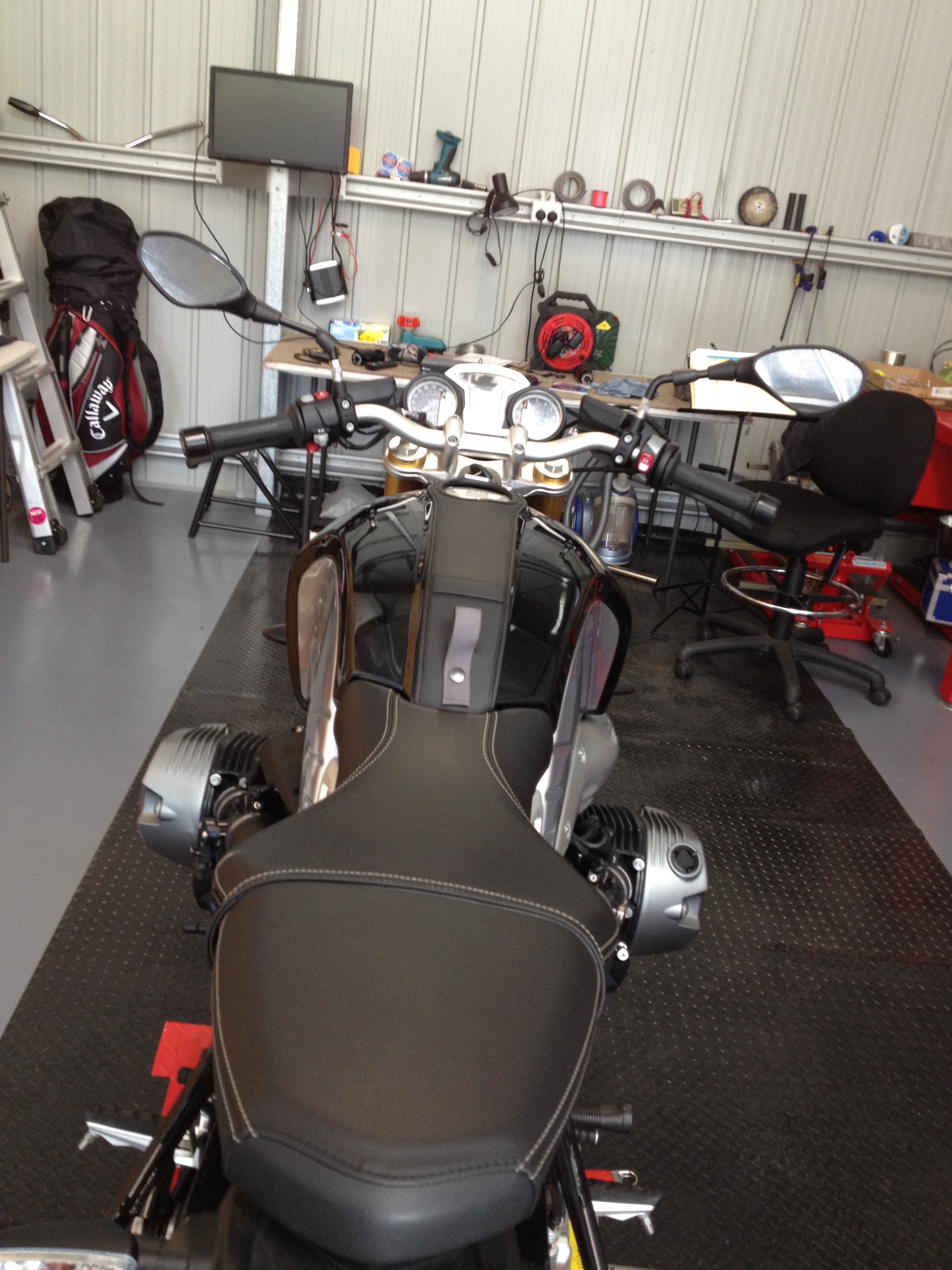 Of course it took me ages to come up with the idea of changing the handle bars. I never liked the original “sit-up” position. I like to ride low and long. It was the rise and position of the handle bars that were my biggest problem with the stock machine. So I took the bars from my F800R and swapped them over to the 9t…