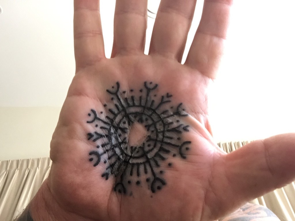 I know, it don’t look like much but it was way over the top of my pain threshold. As you may recall, about a year ago I had this done but it did not take. It wore off. And my ink-family decided I needed to go toe to toe with Maestro-Shane, the ink-on-palm master.