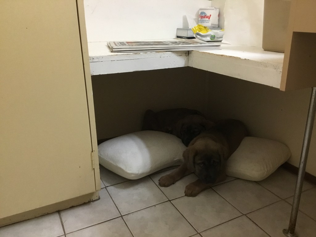 They both hug their pillow in the tiny water-closet. Quel wags her tail as I try to call her out. She hears me and responds but is holding back. Nia just looks at me. Not in a bad way, but she is sad. She misses her mommy.