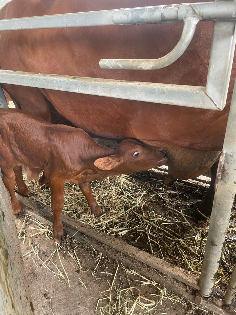 So last eve I pushed mamma into the stock-crush. I tried to get the calf to suckle but failed. I got kicked for my effort. Damn near broke my arm. Was lucky really.