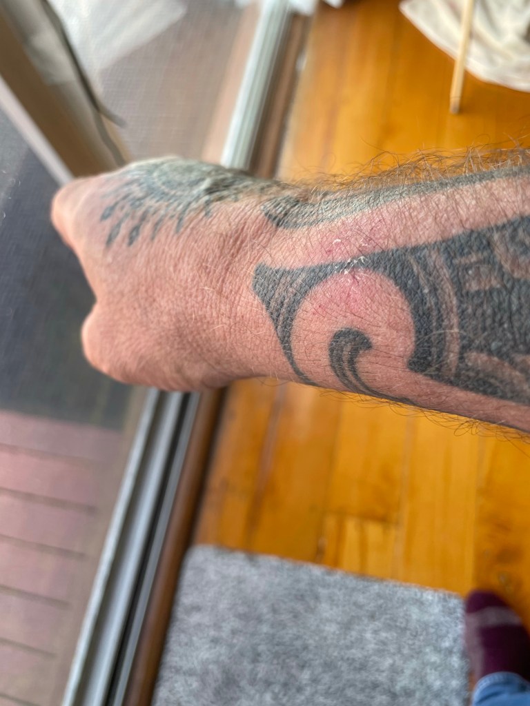 I know it don’t look like much but my forearm above the wrist is beaten and swollen. My hand really hurts. I have rope burns across my fingers where I lost the tug of war.
