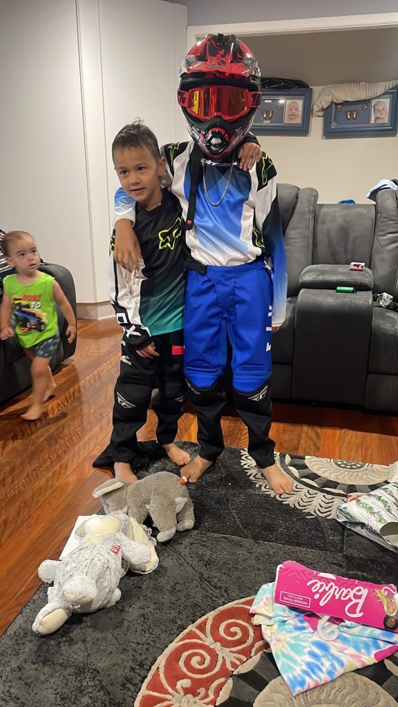 My plans for today originally entailed having our extended family up to raise hell on wheels. What I call a “vroom Bbq”. But the rains have returned and it is a bit of a hassle to have everyone hanging around all wet and muddy. It is fun, it is entertaining, but the kids get hurt more and faster when it’s wet here. So we shall put the vroom-day off. Here’s a picture of Ruben and Hudson in their new riding gear…