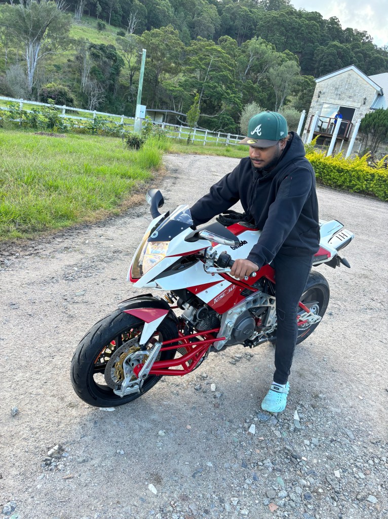 All registered and road ready for Mendoza to enjoy… a Tru-Exotic Motorcycle. (He says its real, real fast)… My old legs dont like the “fit” anymore.