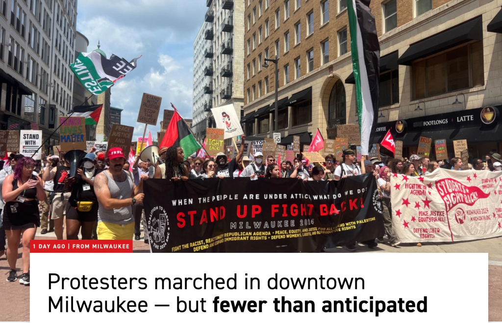 I note there are protests going on outside the convention hall, but I dont see any gratuitous and mindless rioting. Let me check again… OK, I find this: https://www.usatoday.com/story/news/politics/elections/2024/07/16/rnc-arrests-after-monday/74426277007/