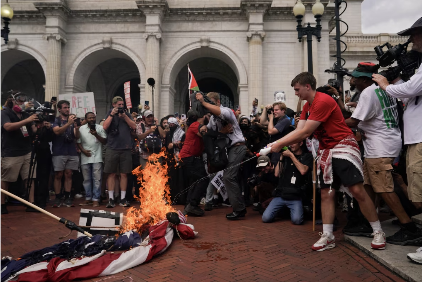 And to celebrate the Democrat Party held a street party in DC. They were welcoming to town the Israeli PM. In his honour they showed their patriotism by burning a flag…