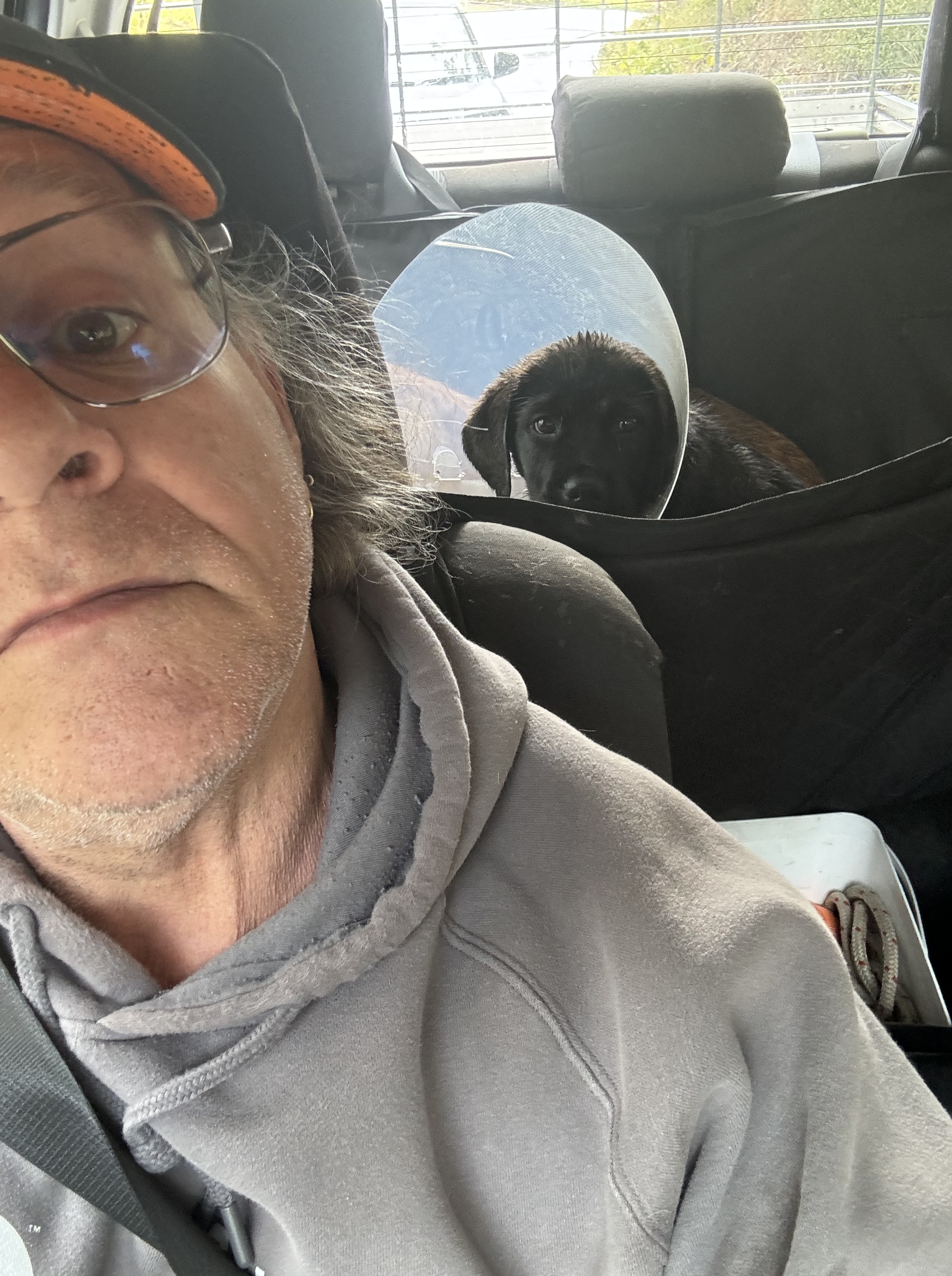 The Vets call the protective collars “hoods of shame”. They are struggling to get used to them. It is quite entertaining…