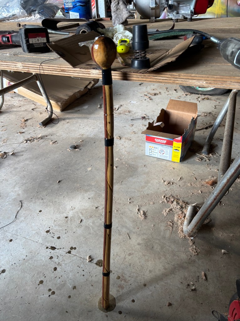 The core is made from ancient hard wood, dug from the ground, exposed by the floods. The exterior is Acacia from tree that blew down last year. The hardwood makes it stable, strong. The soft wood makes it light. I used a burled knot in the Acacia and whittled a shillelagh, a knobkerrie style stick. A bit of whipping in strategic places, lots of epoxy resin and its an all but unbreakable, very flexible, very light, very cool stick.