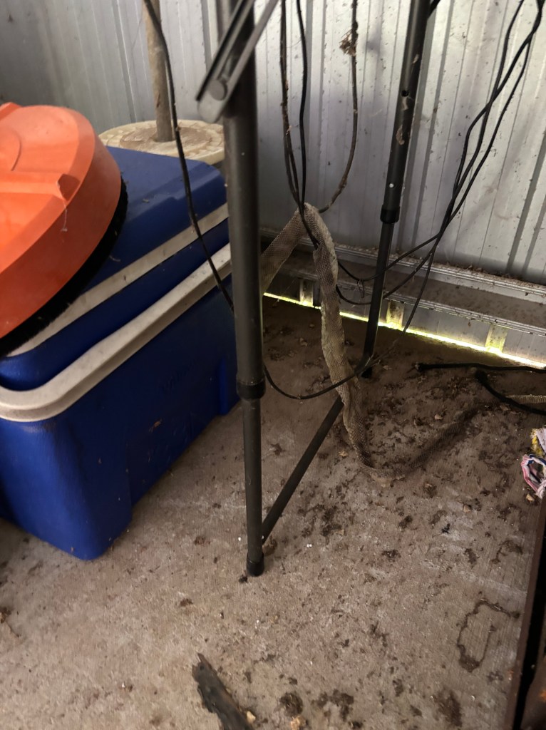 I found a small skin on the floor just a couple weeks ago. Nothing really new. Every once in a while I’ll hear/ find a snake behind a pile of plywood or under a neglected tarp. Most common is that the snakes run n hide and stay away, if you make enough noise. Or such is the theory…