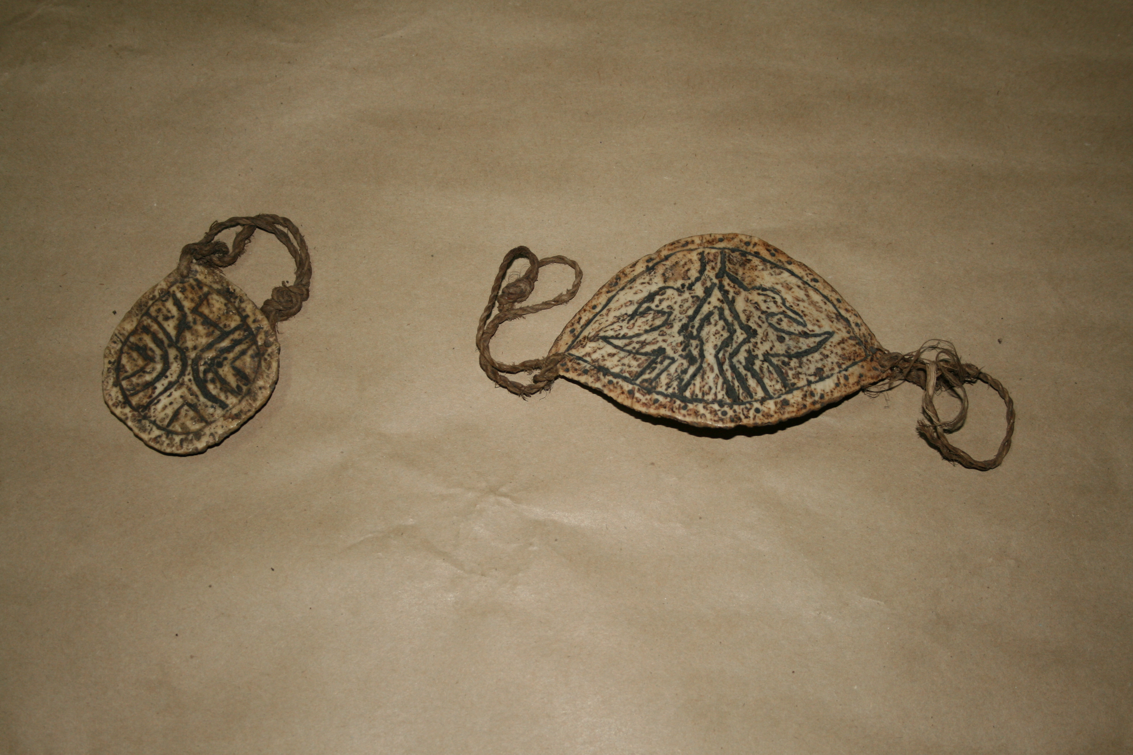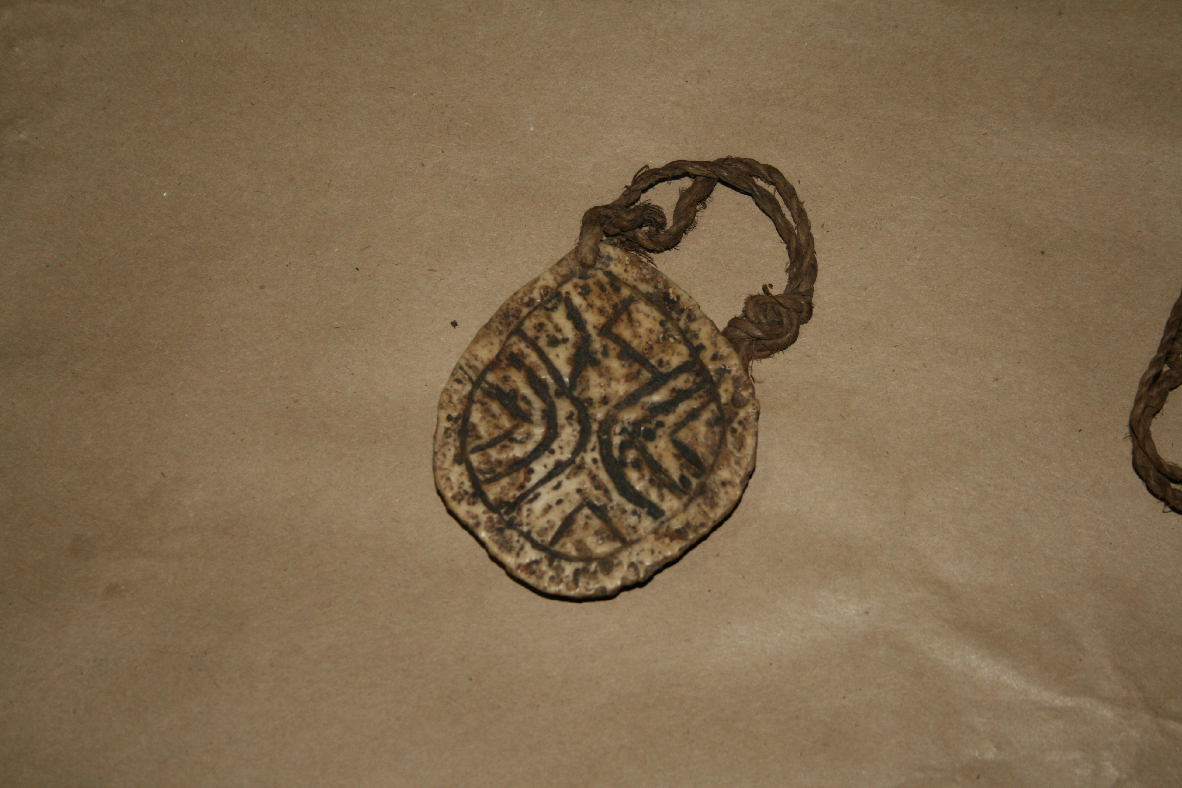These are interesting and gruesome… I have studied these and sought assistance… it would appear that these are pendants made from human skull bone. Not sure if I am going to make a bola tie out of either but is an idea…